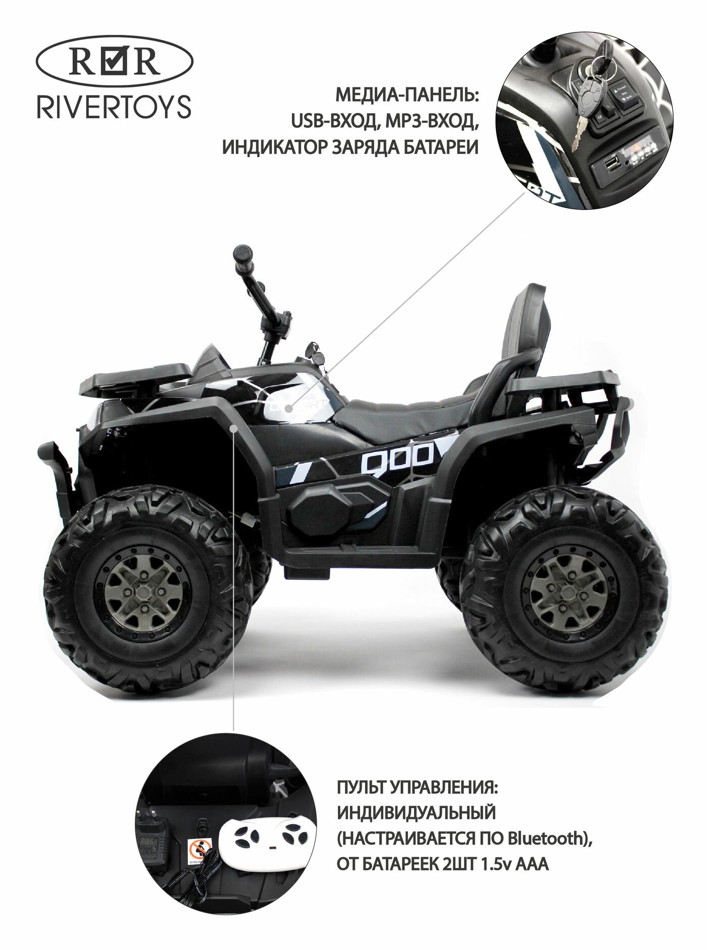 Купить Детский электроквадроцикл RiverToys H999HH черный Spider, полноприводный, с пультом