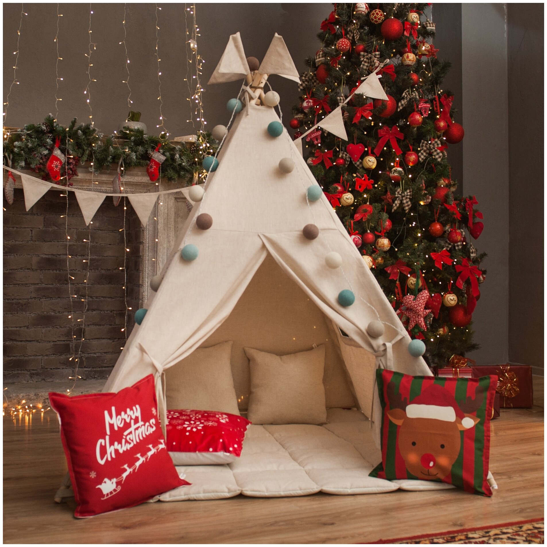 Купить Детский вигвам льняной Vigvam Shop с матрасиком, флажками, 2 наволочками и системой антискладывания 130*130 см