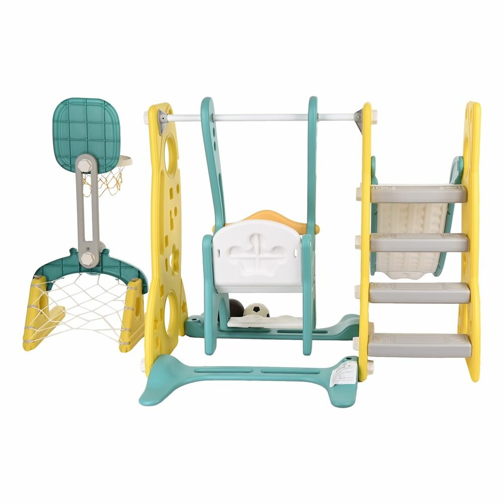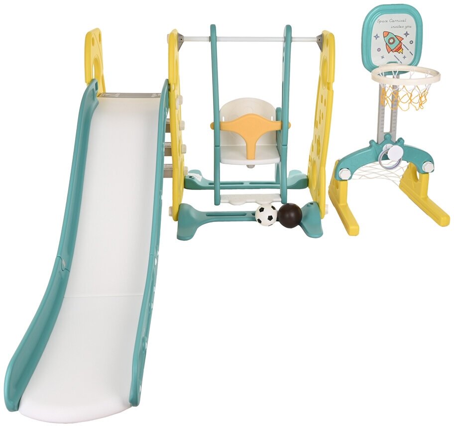 | Комплектация | пластиковая горка, качели, лесенка, кольцо баскетбольное (1 шт.) (d=29 см), ворота, баскетбольный мяч - 1шт. (d=12 см); футбольный мяч – 1 шт. (d=11 см), кольца - 4 шт. (d=11 см) |