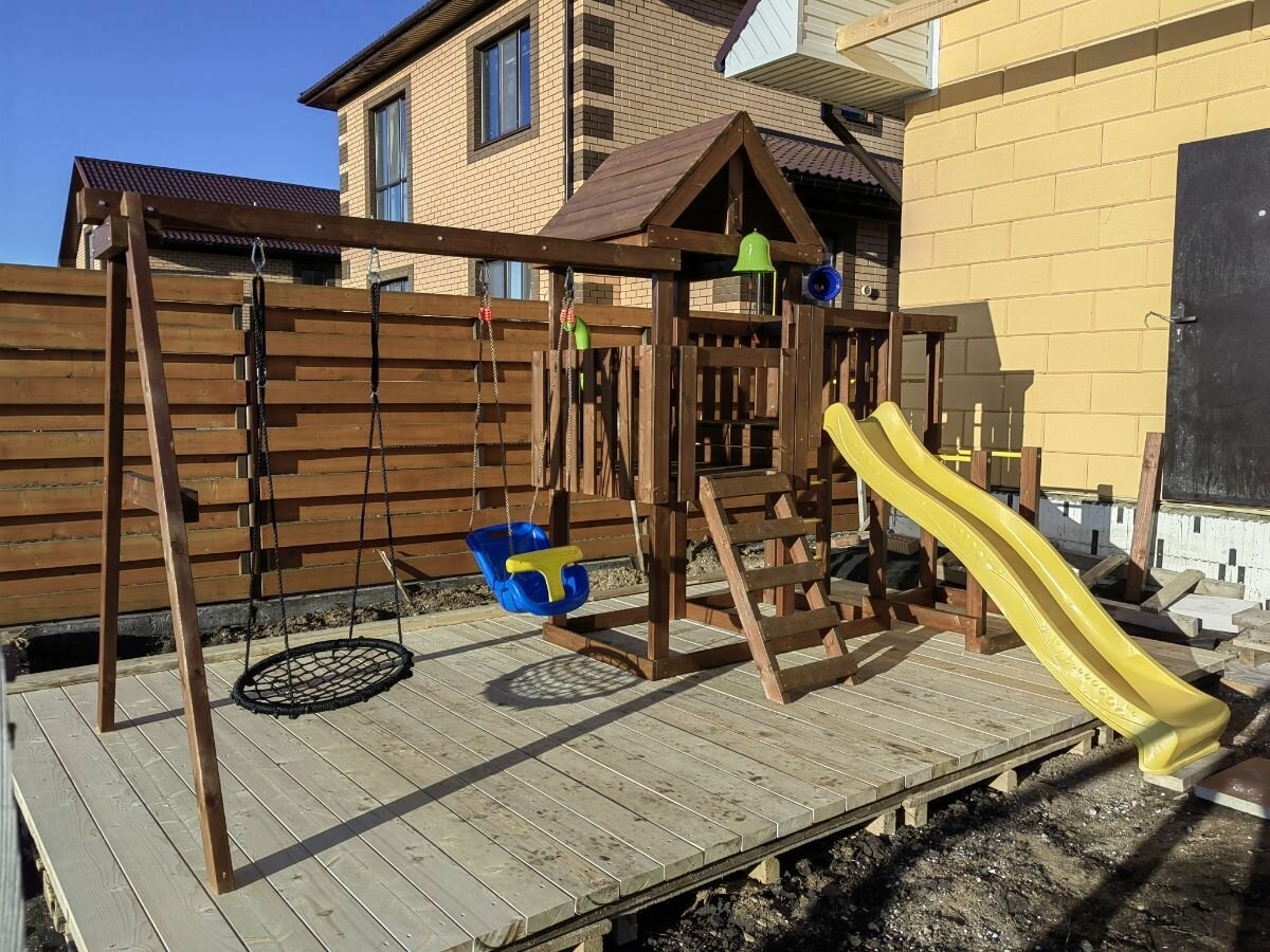 | Комплектация | Деревянный игровой домик Деревянная крыша Качельная балка Балкон Гимнастическая секция ( турник, шведская стенка, брусья, рукоход) Лестница с зацепами для скалодрома Баскетбольное кольцо с сеткой Горка пластиковая двухслойная с двойной волной 1753 мм (Бельгия) Качели без спинки - 1 шт (Бельгия) Качель гнездо 60 см - 1 шт -1 шт (Бельгия) Тонированная антисептическая пропитка на водной основе с увеличенной концентрацией защитных компонентов Шаблон для сверления отверстий Инструкция по сборке |
