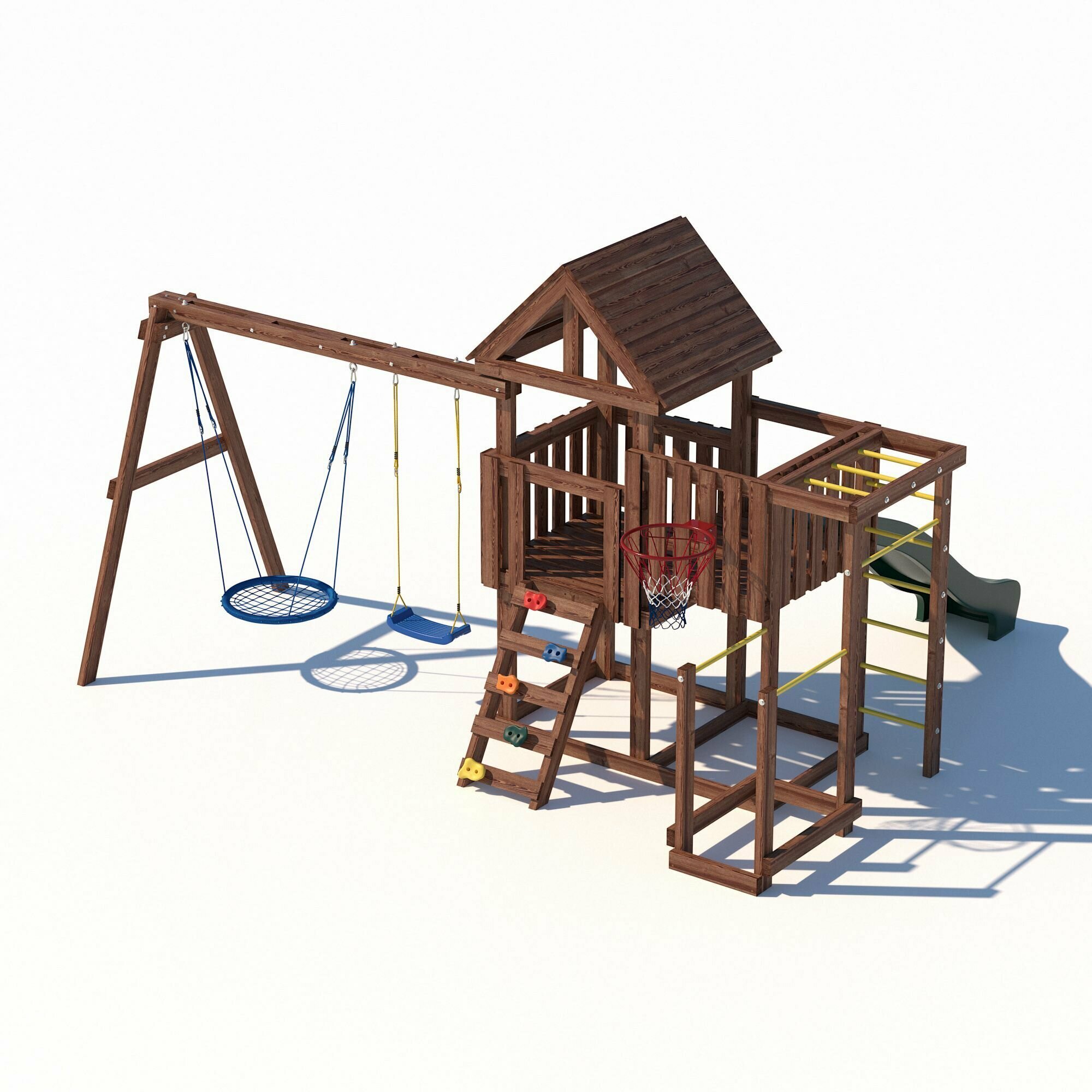 | В комплекте | баскетбольное кольцо, брусья, домик, качели, лестница, рукоход, скалолазная стенка, турник |