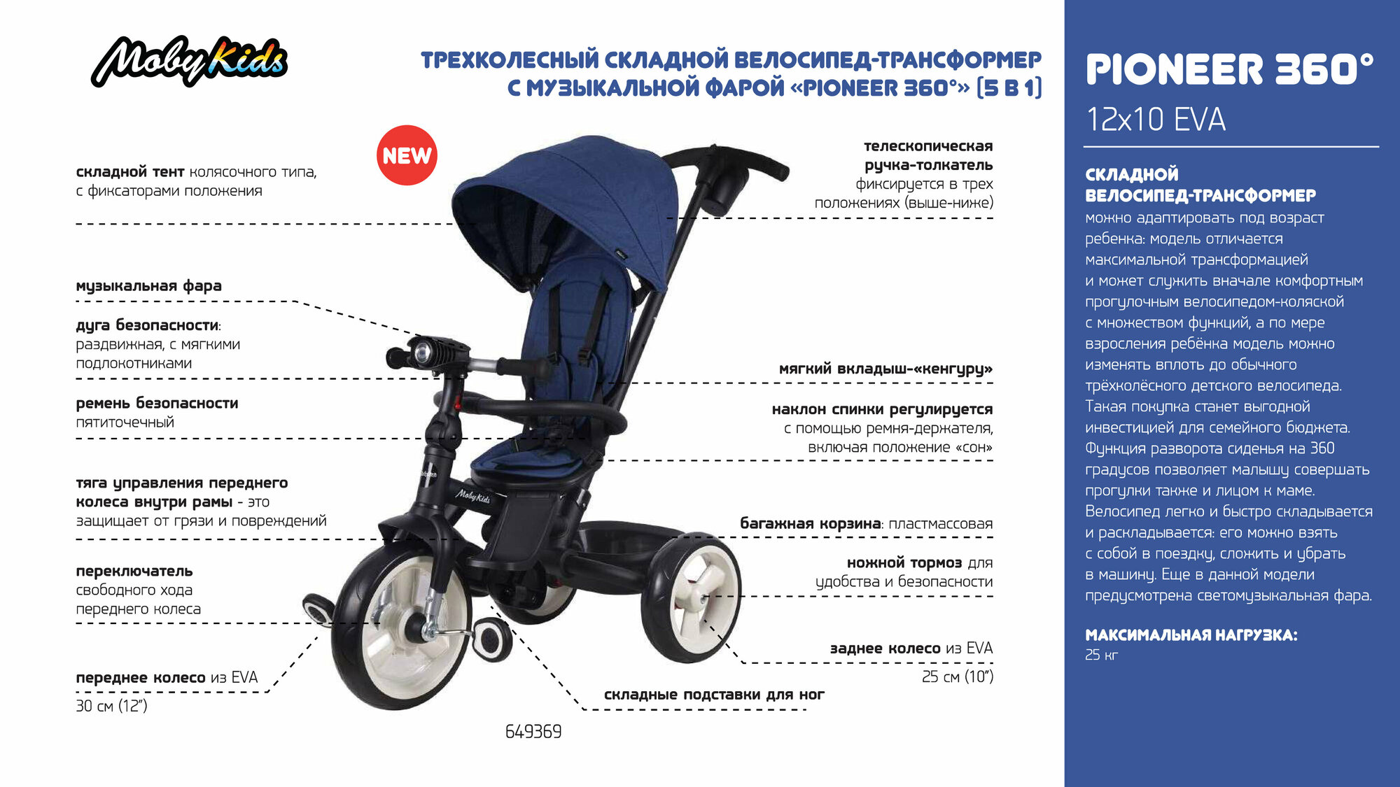Складной трёхколёсный велосипед 5 в 1 Moby Kids Pioneer 360° 12x10 EVA со светом и музыкой 649369 интересное: