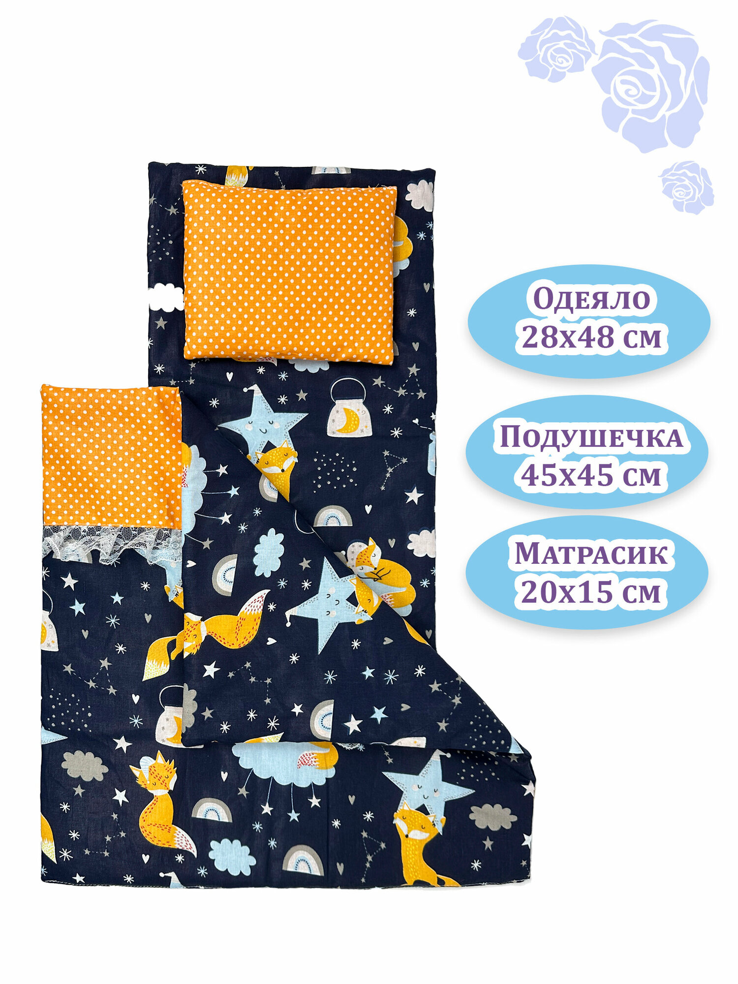 Постель для кукол/ Одеяло, матрас, подушка для куклы/ Лисички