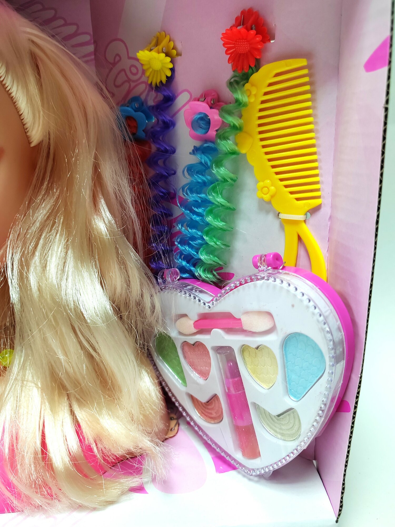 | Комплектация | кукла, расческа, 3 накладные цветные пряди на заколочках, набор теней с помадой |