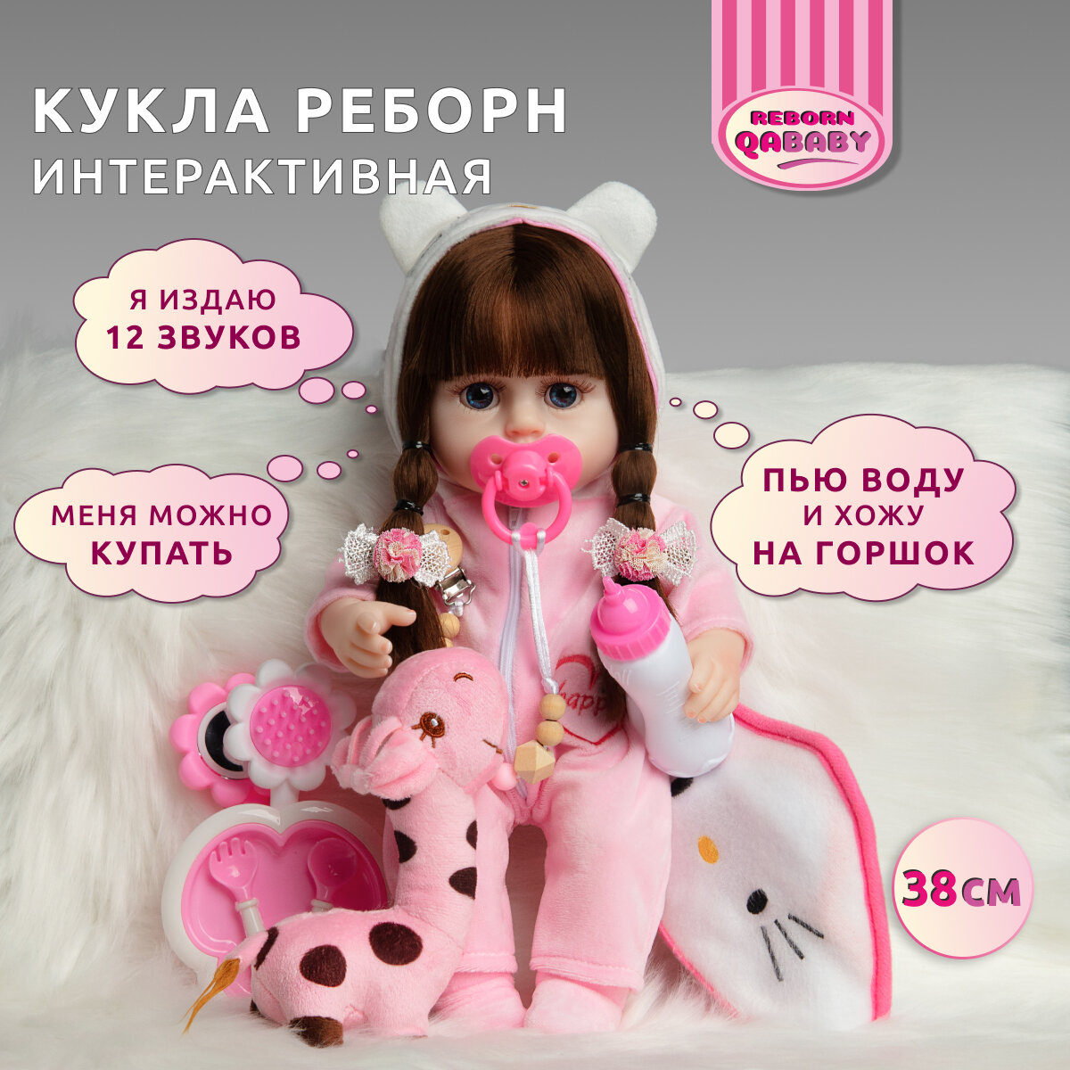 | Комплектация | 1) Кукла Реборн девочка Роза винил-силиконовая говорящая интерактивная - 1 шт; 2) Комплект одежды игрушки как на фото: комбинезон костюм с капюшоном, носочки - 1 шт; 3) Соска на ленте – 1 шт, Держатель для соски - 1 шт; 4) Полотенце пеленка Hello Kitty - 1 шт, Заколки - 2 шт; 5) Подгузник памперс – 1 шт, ЗВУКОВОЙ ЭЛЕМЕНТ в спине - 1 шт; 6) Бутылочка для кормления – 1 шт; 7) Расческа - 1 шт, Зеркало - 1 шт, Тарелка - 1 шт, Ложка - 1 шт, Вилка - 1 шт; 8) Свидетельство о рождении – 1 шт; 9) Рекомендации по уходу – 1 шт; 10) Подарочная коробка Reborn QA BABY – 1 шт; 11) Фирменная коробка Reborn QA BABY – 1 шт; 12) Мягкая игрушка Подарок - 1 шт |