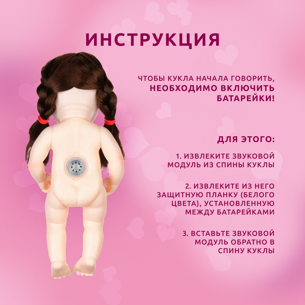 | Функции | вращается голова / говорит / плачет / пьет / пьет-писает / смеется |