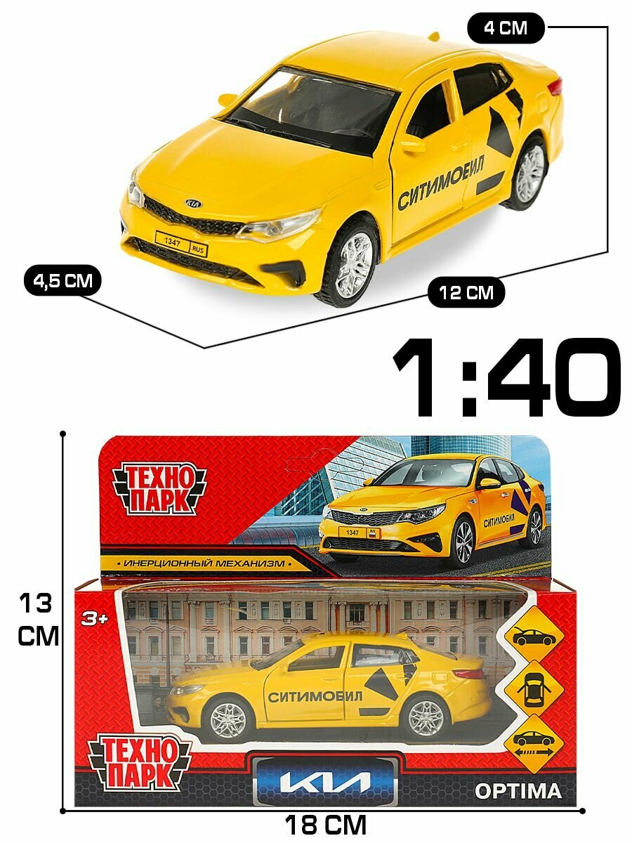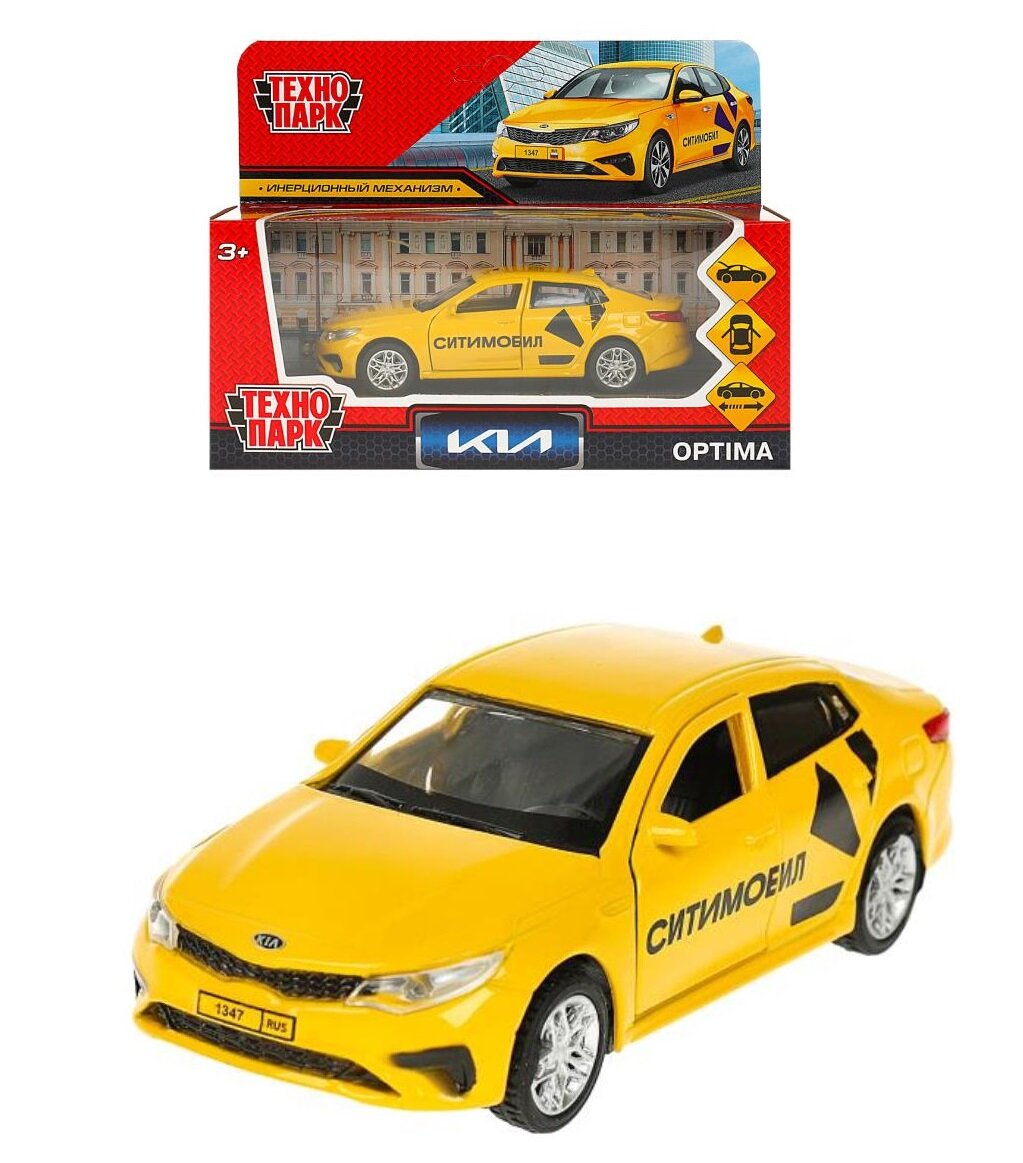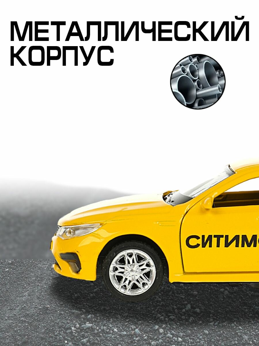 Машинка детская KIA Optima Такси Ситимобил 12 см, Технопарк, желтая, открываются двери и багажник, металлический корпус