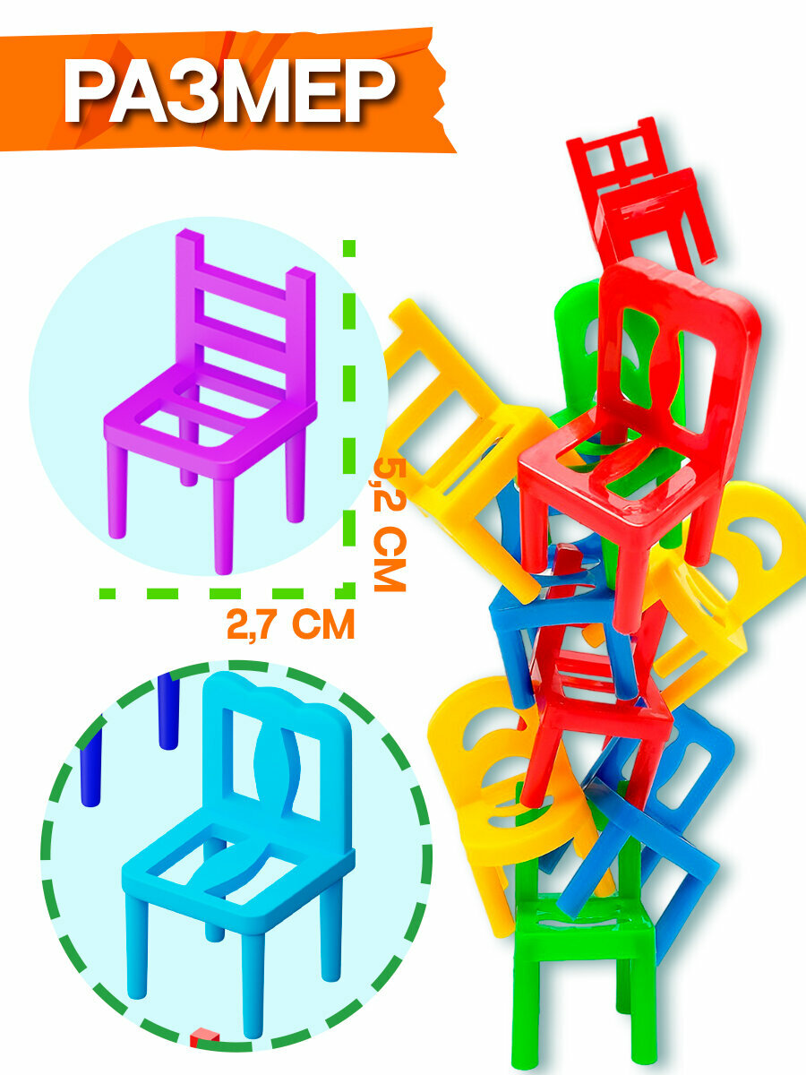 | Дополнительная информация | Как играть Задача каждого игрока — избавиться от своих стульчиков, расположив каждый из них так, чтобы башня не упала. Определите очерёдность игроков. Первый игрок ставит первый стульчик. Второй и последующие игроки ставят свои стульчики сверху таким образом, чтобы сохранить баланс и не уронить всю конструкцию. Игрок, в результате хода которого башня упала, забирает все стульчики себе. Побеждает игрок, который первым избавится от всех своих стульчиков. |