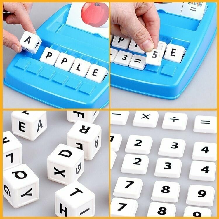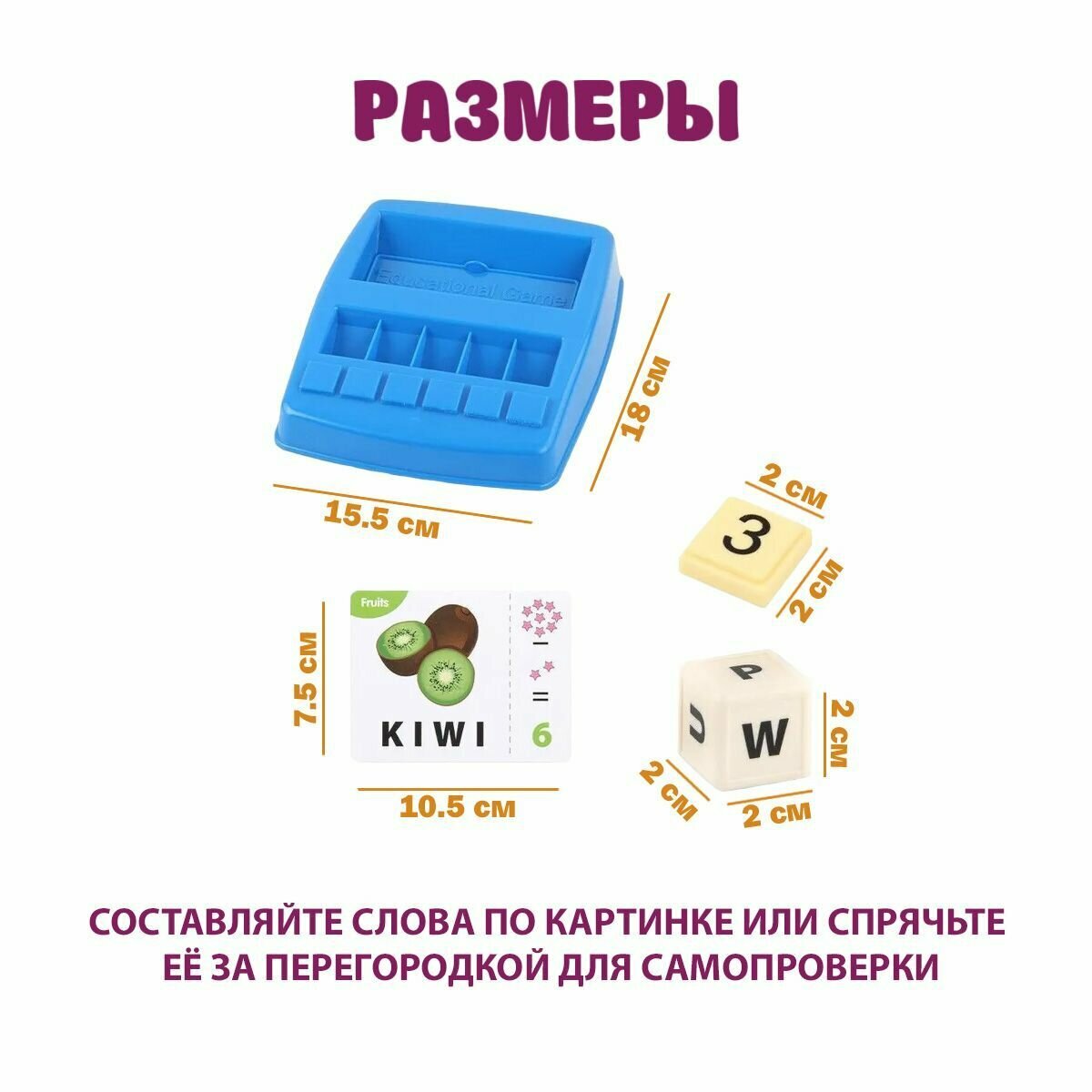 | Комплектация | 10 кубиков с буквами (60 букв в итоге), 20 квадратиков с цифрами, 5 квадратиков с математическими знаками, 32 двусторонние карточки со словами на разную тематику и математическими примерами, Подставка для игры в которой можно спрятать слово, оставив только картинку. |