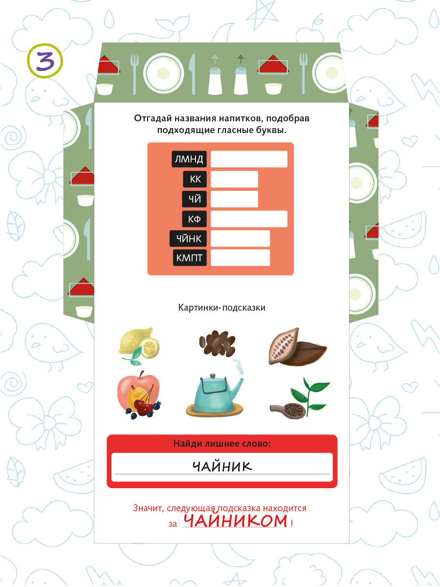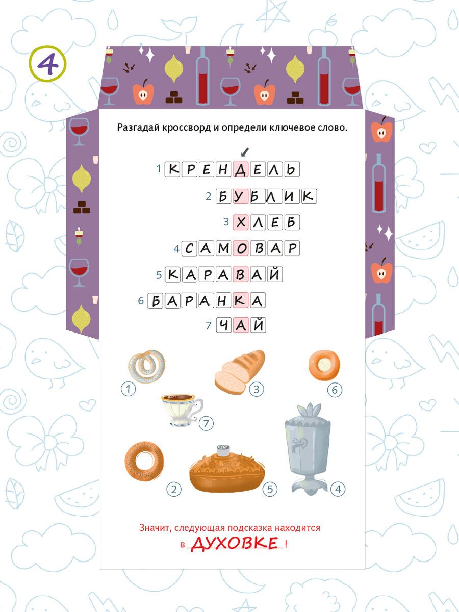 | Дополнительная информация | Для подготовки квеста понадобится всего 15 минут, В каждое письмо-конвертик нужно вложить один элемент пазла, Спрятать конвертики в места согласно инструкции, Для подсказок можно также использовать наклейки стрелочки и звездочки, |