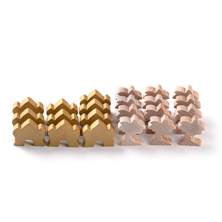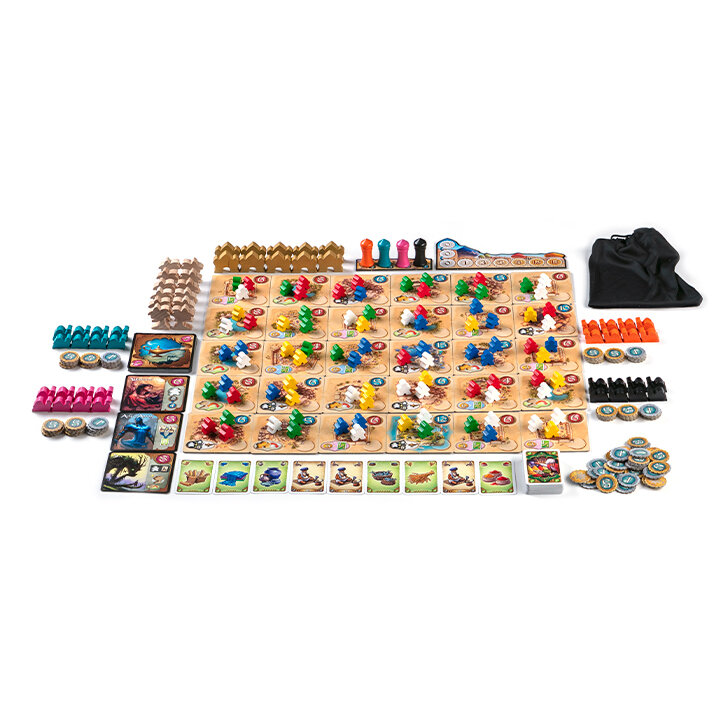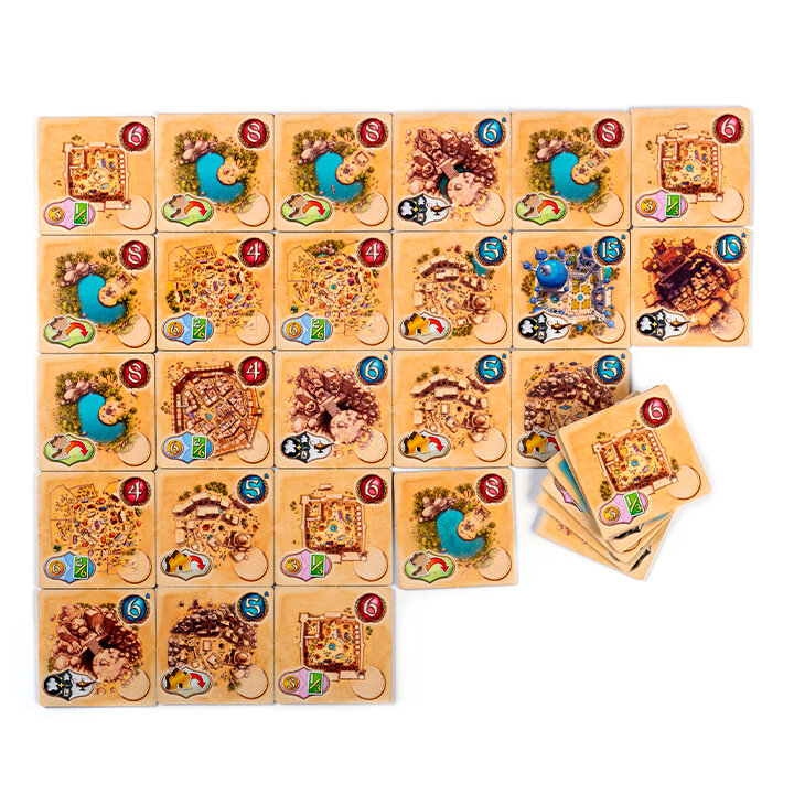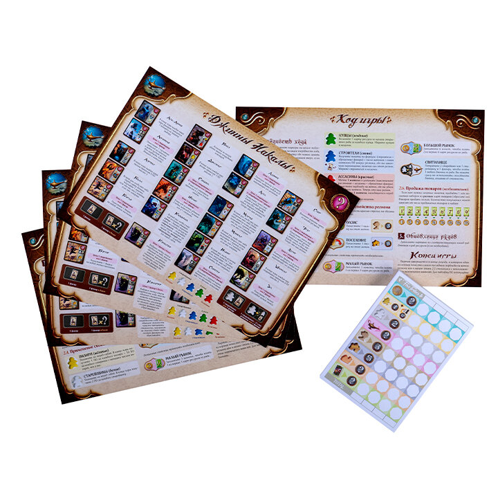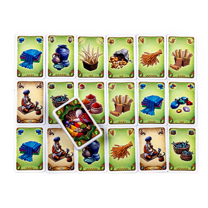 | Комплектация | 5 памяток, блокнот для подсчёта очков, 6 маркеров игроков, 33 фишек верблюдов, шкала подготовки к раунду, шкала очерёдности хода, 90 фишек жителей, мешочек, 12 фишек пальм, 10 фишек дворцов, 30 жетонов регионов, 22 карты джинов, 54 карты ресурсов, 96 жетонов монет |