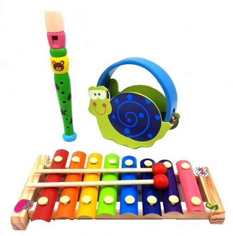 Купить Деревянные музыкальные инструменты - Набор "Металлофон + Бубен + Флейта"