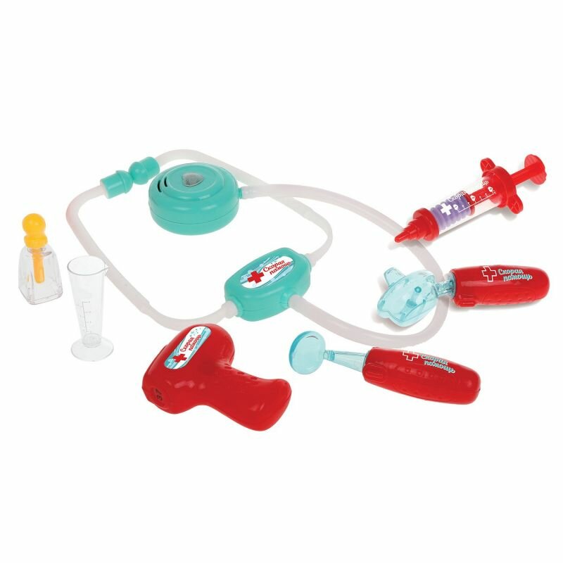 | Дополнительная информация | размеры предметов: фонендоскоп - 17 х 13 х 2 см, длина шнура с функциональной частью 33 см; градусник - 7,5 х 3 х 10 см; шприц - 13 х 5 х 3 см; мензурка - 7 х 3 х 3 см; флакончик - 2,5 х 2,5 х 6,5 см; отоскоп - 13 х 5 х 4,5 см; зеркальце - 12 х 2,5 х 3 см; молоточек - 12,5 х 6 х 3 см |