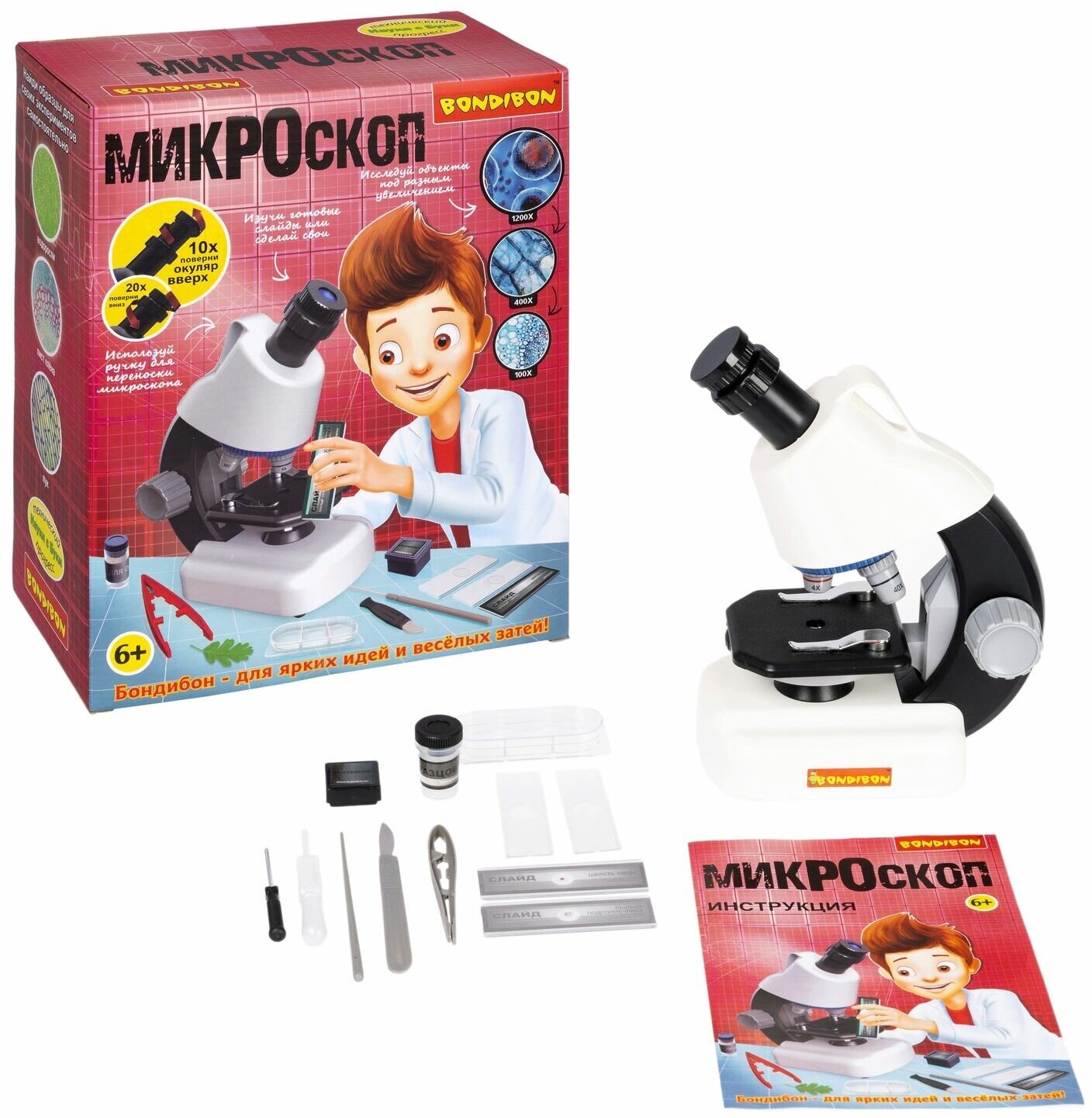 Набор для опытов Bondibon Технический прогресс Науки с Буки "микроскоп", увеличение 100X,400X,1200X, с аксессуарами, пластик, белый (ВВ5286) интересное:
