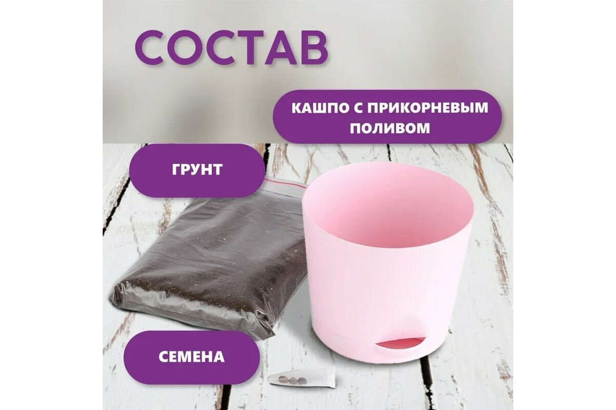 | Комплектация | пластиковый горшок объемом 0,4 литра с системой прикорневого полива, семена, плодородный грунт |