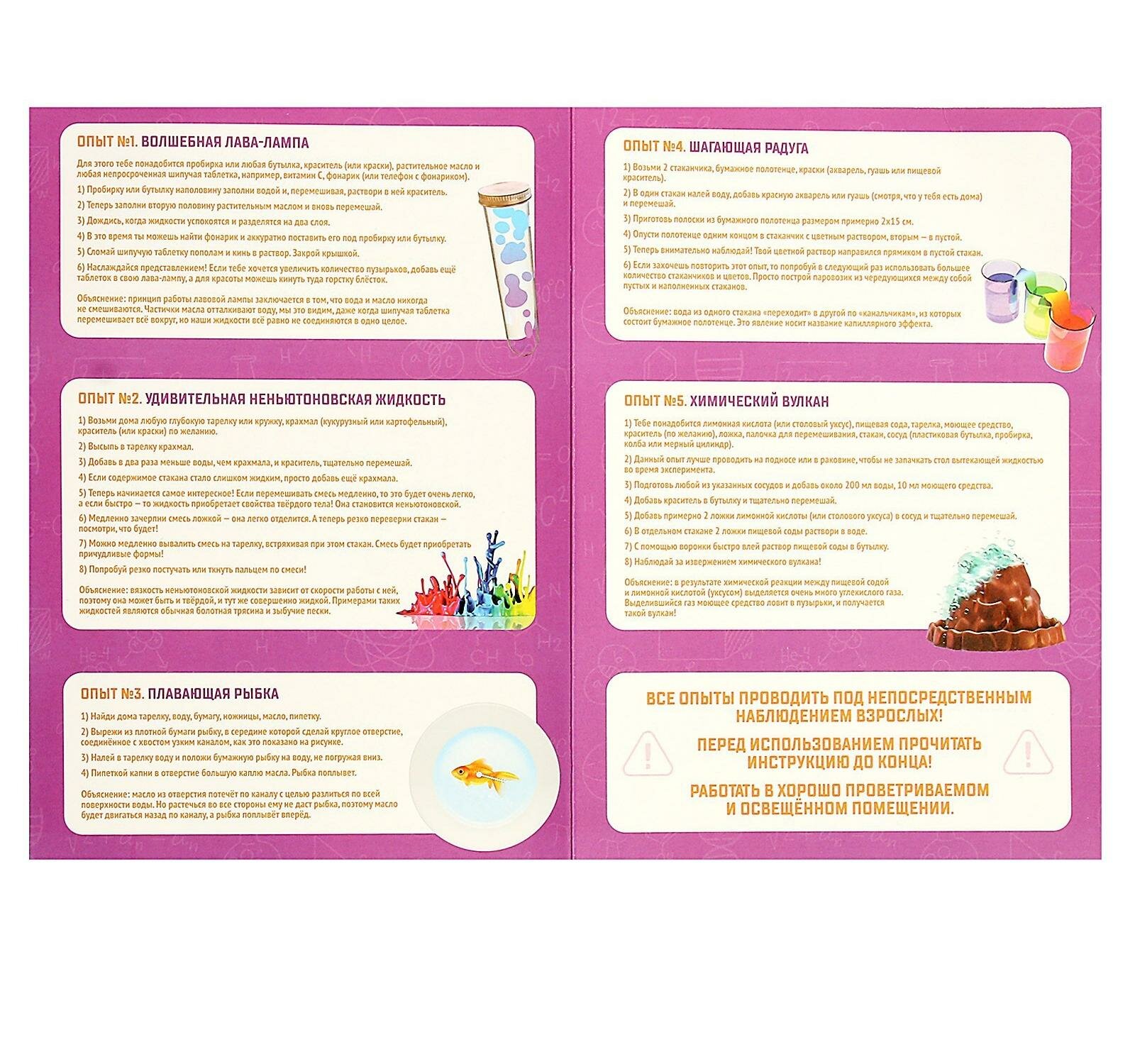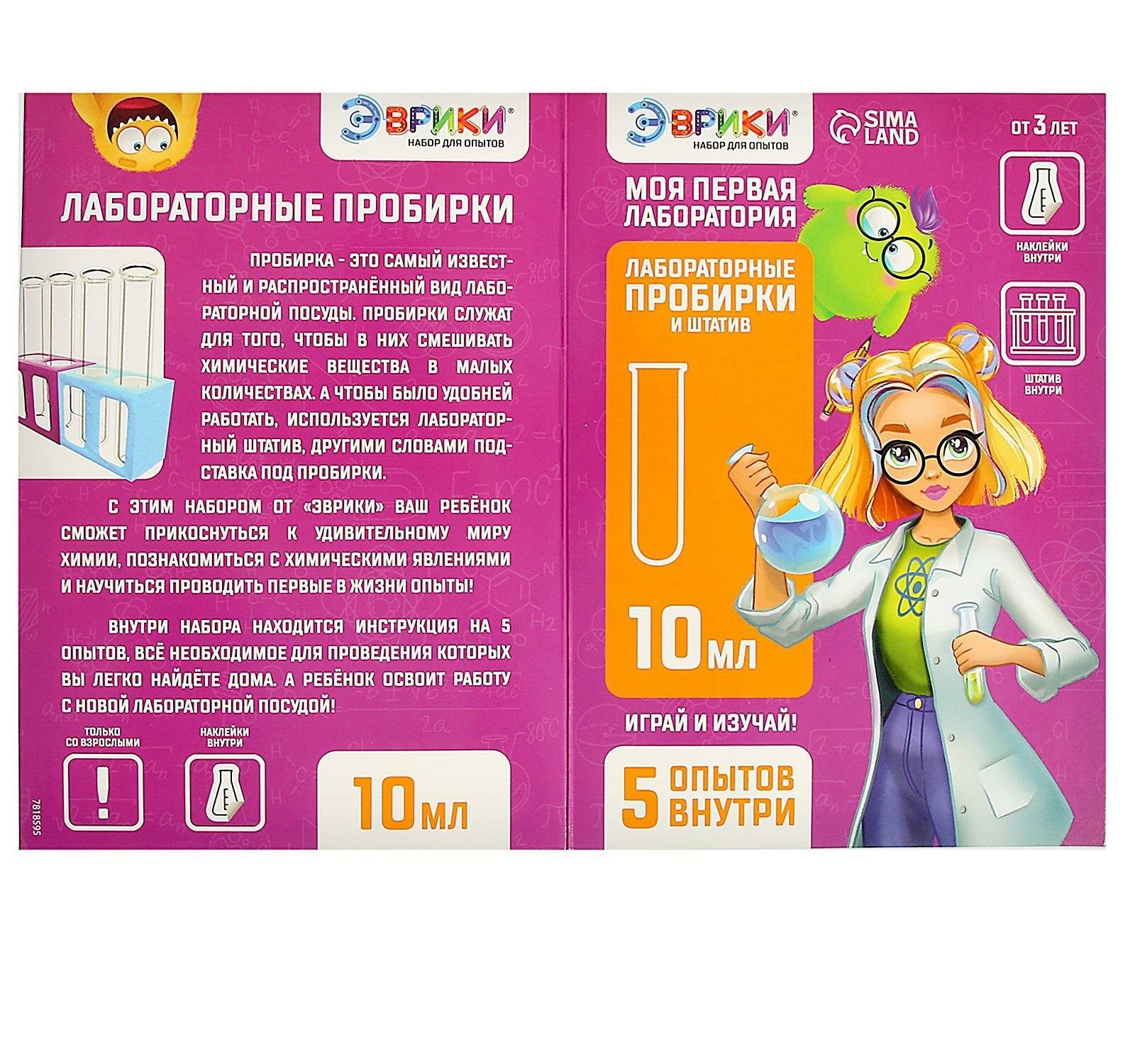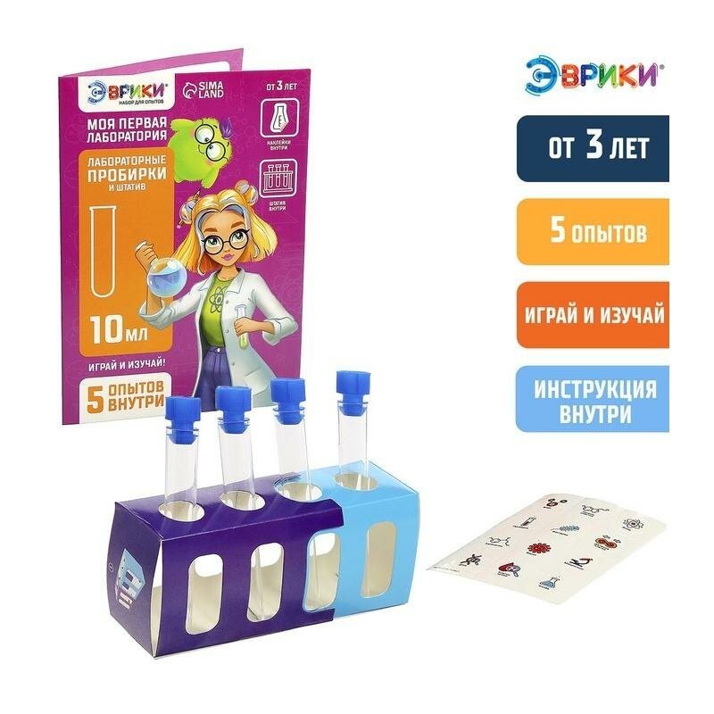 | Комплектация | инструкция с подробным описанием к 5 экспериментам, лабораторные пробирки, штатив и тематические наклейки |