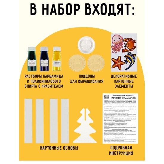 Комплект 15 шт, Набор для выращивания кристаллов 3в1 ТРИ совы "Лучистый. Коралл. Дерево", синий, желтый, зеленый