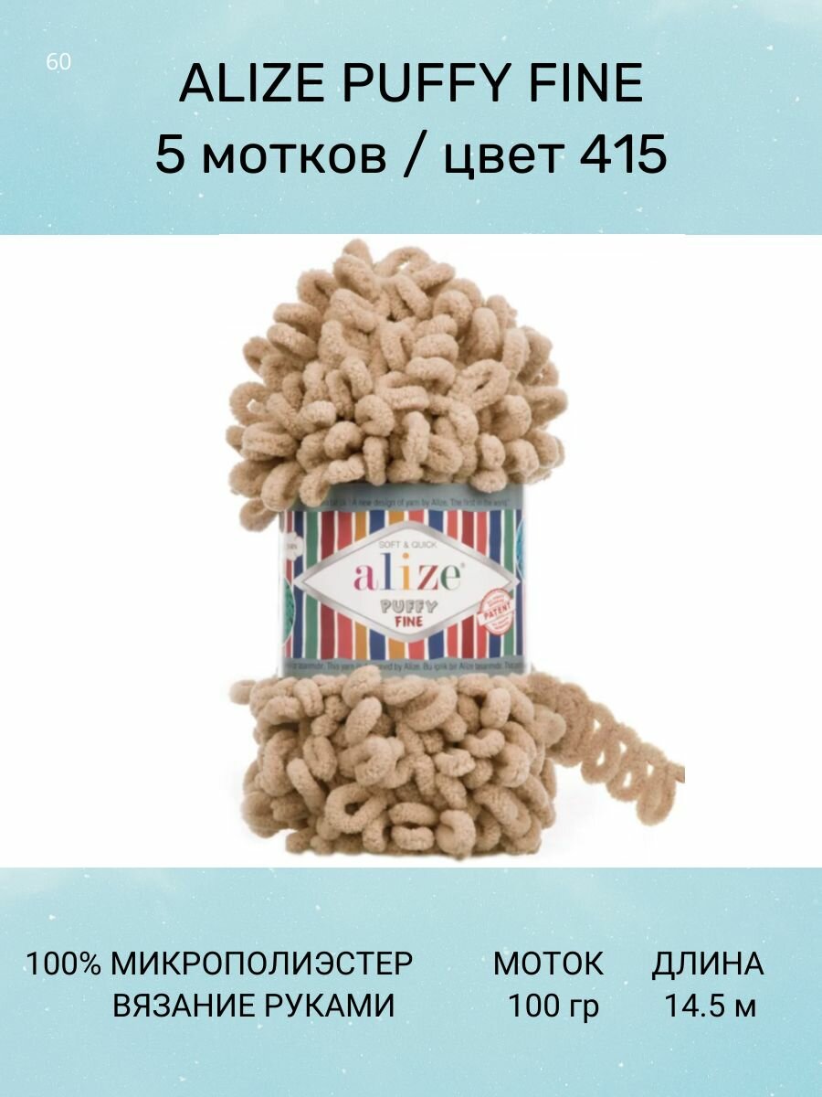 Пряжа для вязания плюшевая с петельками Alize Puffy Fine, цвет 415 песочный, 100г, 14,5м, 5 шт/упак
