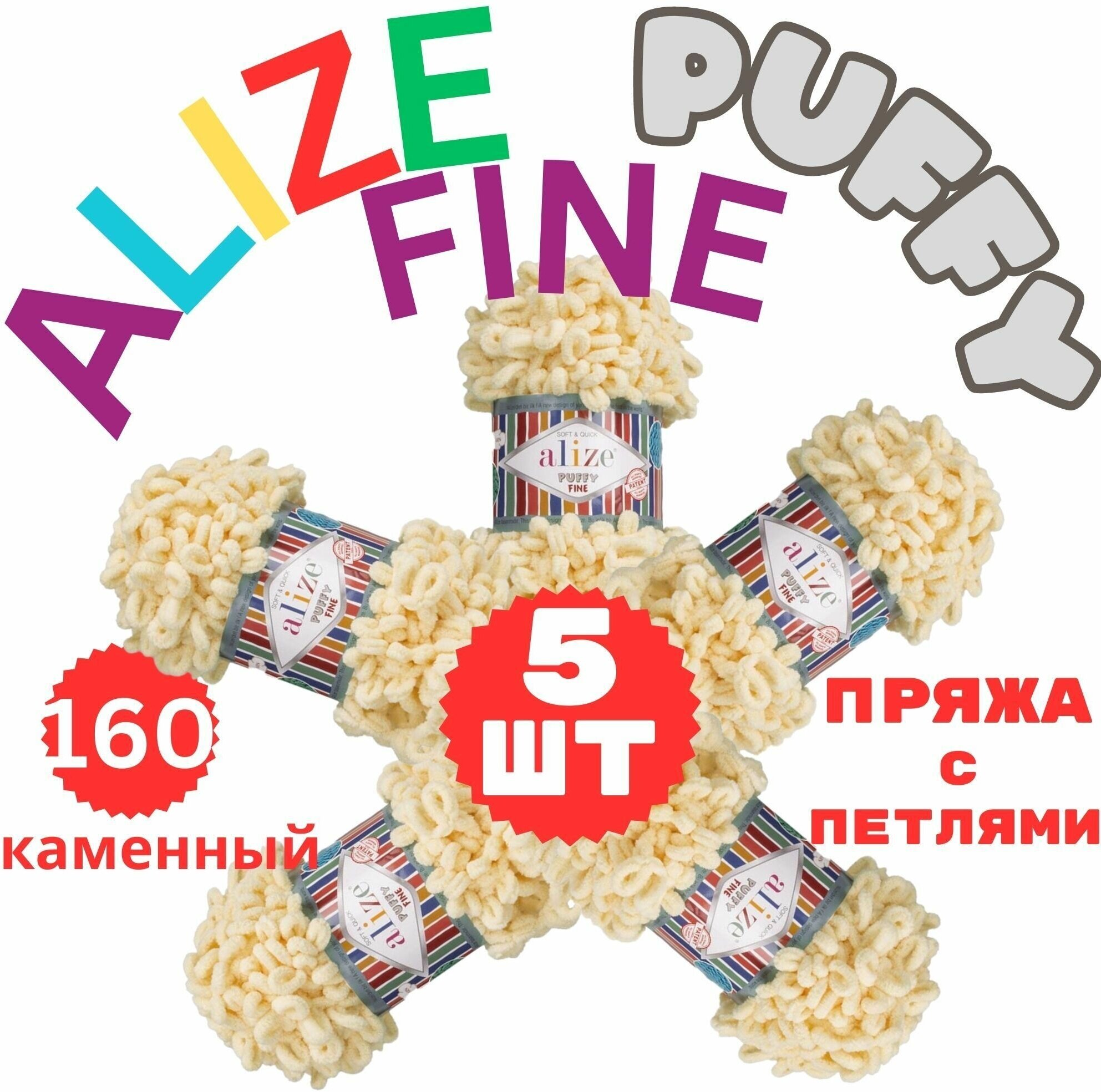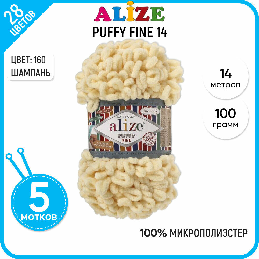 Пряжа плюшевая Alize Puffy Fine (Пуффи Файн) - 5 мотков 310 шампань, для вязания рукми, маленькие петельки (2см), 100г 14м