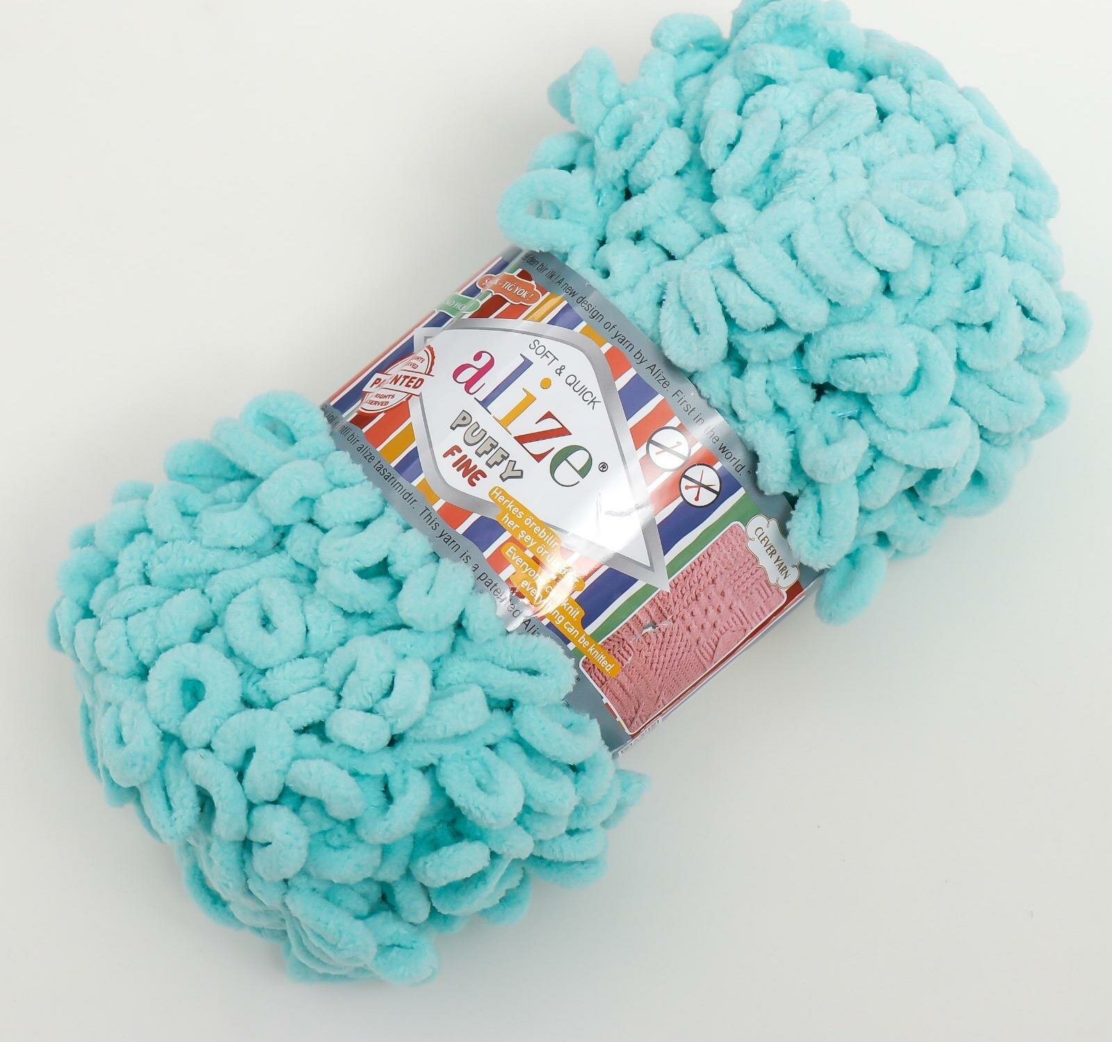 Пряжа Alize Puffy Fine -1 шт, 414 лазурный, 14 м/100 г, маленькие петли (2 см) /Ализе Пуффи файн/