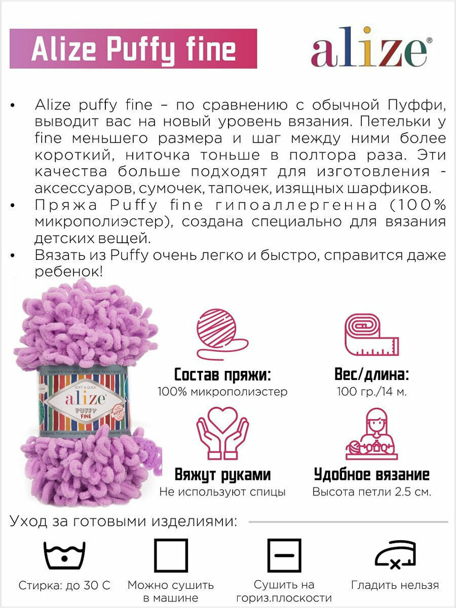 Пряжа PUFFY FINE (Alize), фиалка - 851, 100% микрополиэстер, 5 мотков, 100 г., 14 м.