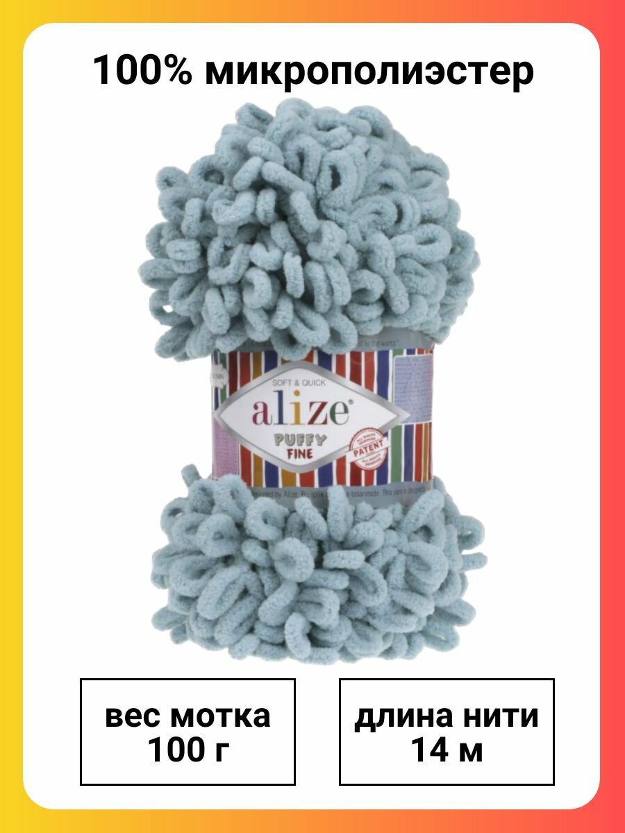 Пряжа Alize Puffy Fine -1 шт, 414 лазурный, 14 м/100 г, маленькие петли (2 см) /Ализе Пуффи файн/