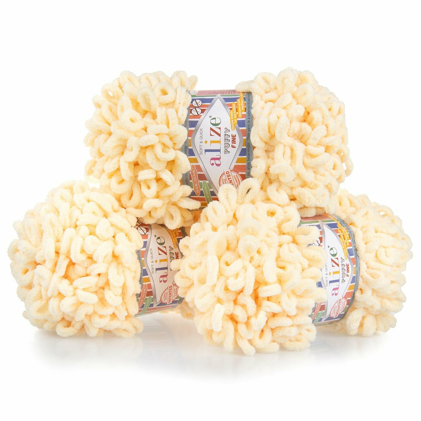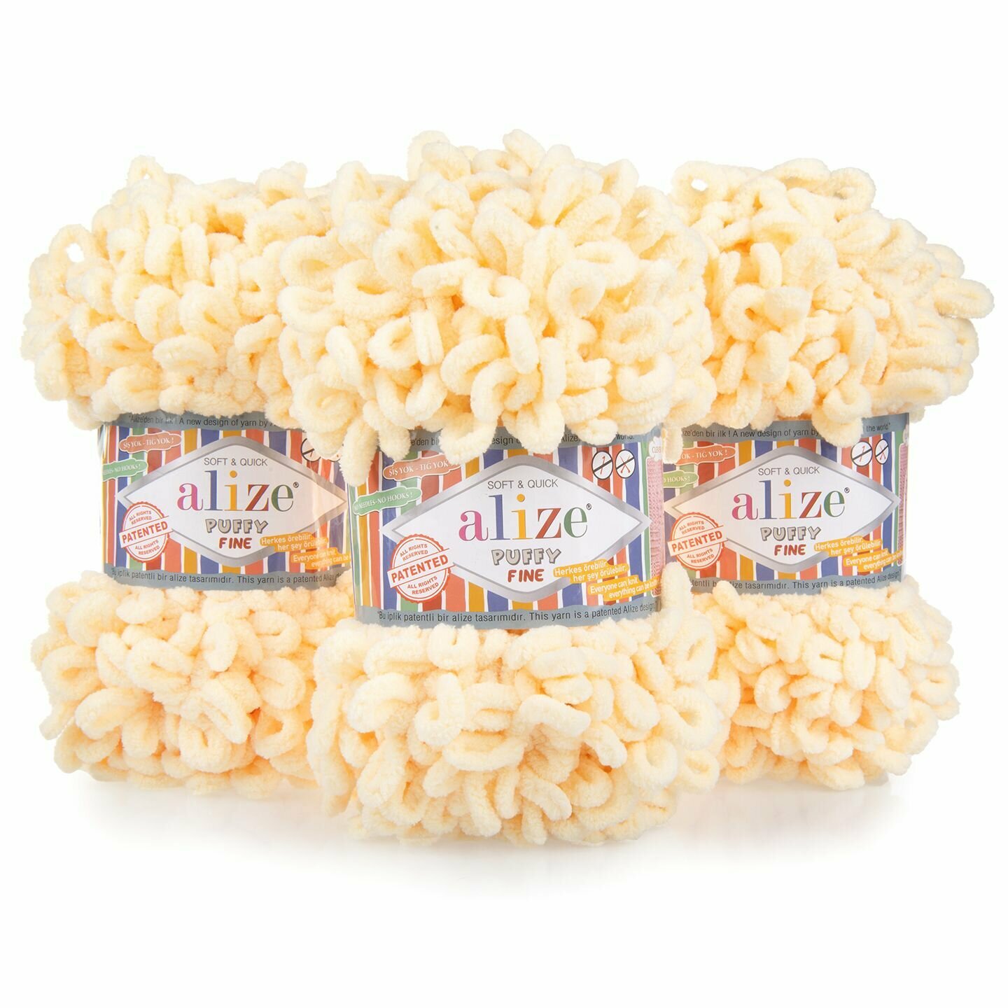 Пряжа плюшевая Alize Puffy Fine (Пуффи Файн) - 5 мотков 599 слоновая кость, для вязания рукми, маленькие петельки (2см), 100г 14м