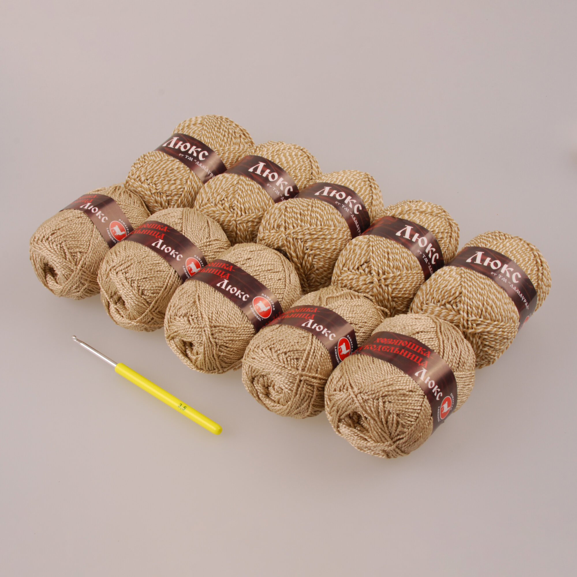 | Комплектация | 10 мотков пряжи Хозяюшка-рукодельница "Люкс", крючок для вязания №3 |