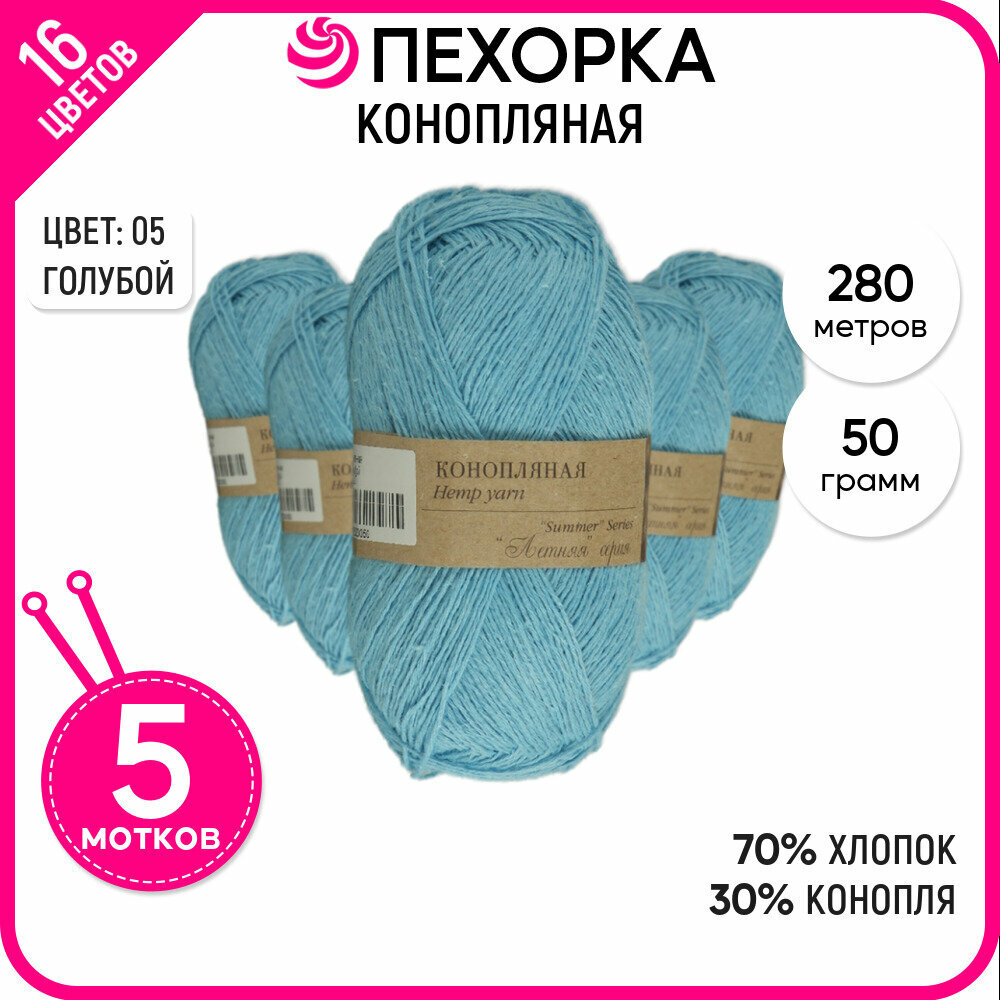 Пряжа Пехорка Конопляная голубой (005), 70%хлопок/30%конопля, 280м, 50г, 5шт