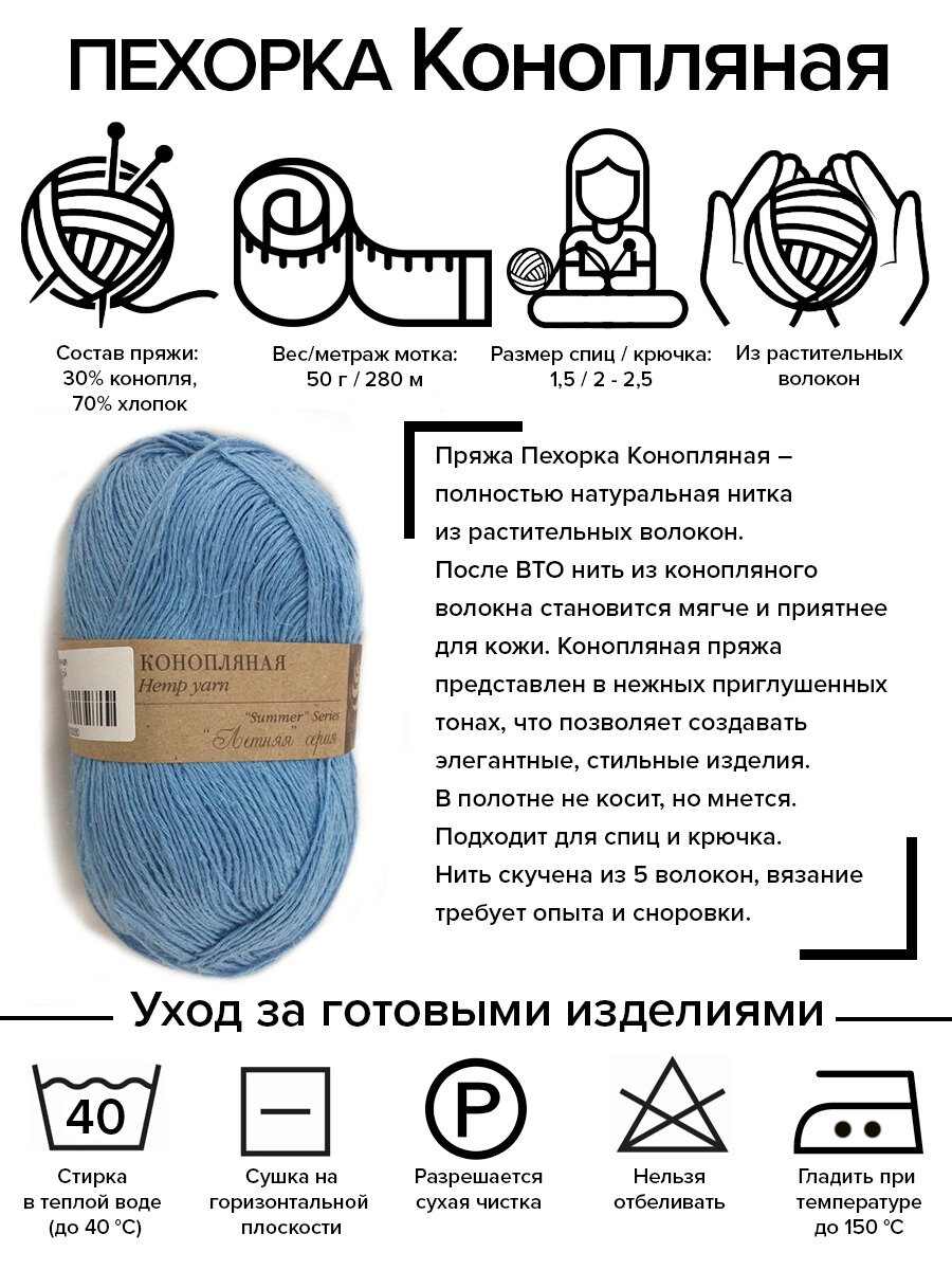 Пряжа Пехорка Конопляная голубой (005), 70%хлопок/30%конопля, 280м, 50г, 1шт
