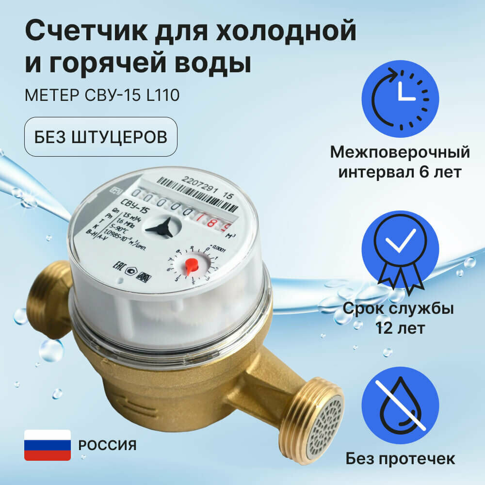 Счетчик для холодной и горячей воды метер СВУ-15 L110, без штуцеров