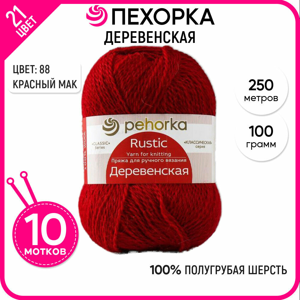 Купить Пряжа для вязания Пехорка 'Деревенская', 100г, 250м (100% шерсть) (88-Красный мак) 10 мотков