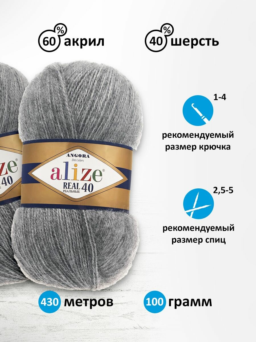 Пряжа Alize Angora Real 40 серый (21), 60%акрил/40%шерсть, 430м, 100г, 2шт