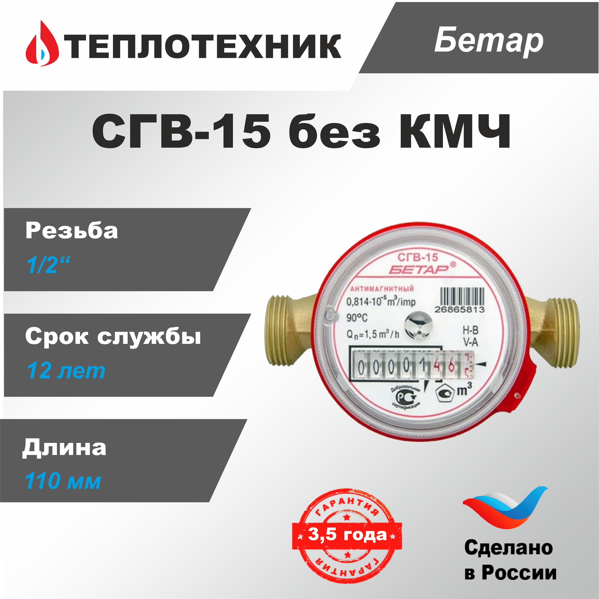 Универсальный счётчик Бетар СГВ-15 без монтажного комплекта, L110, Ду15