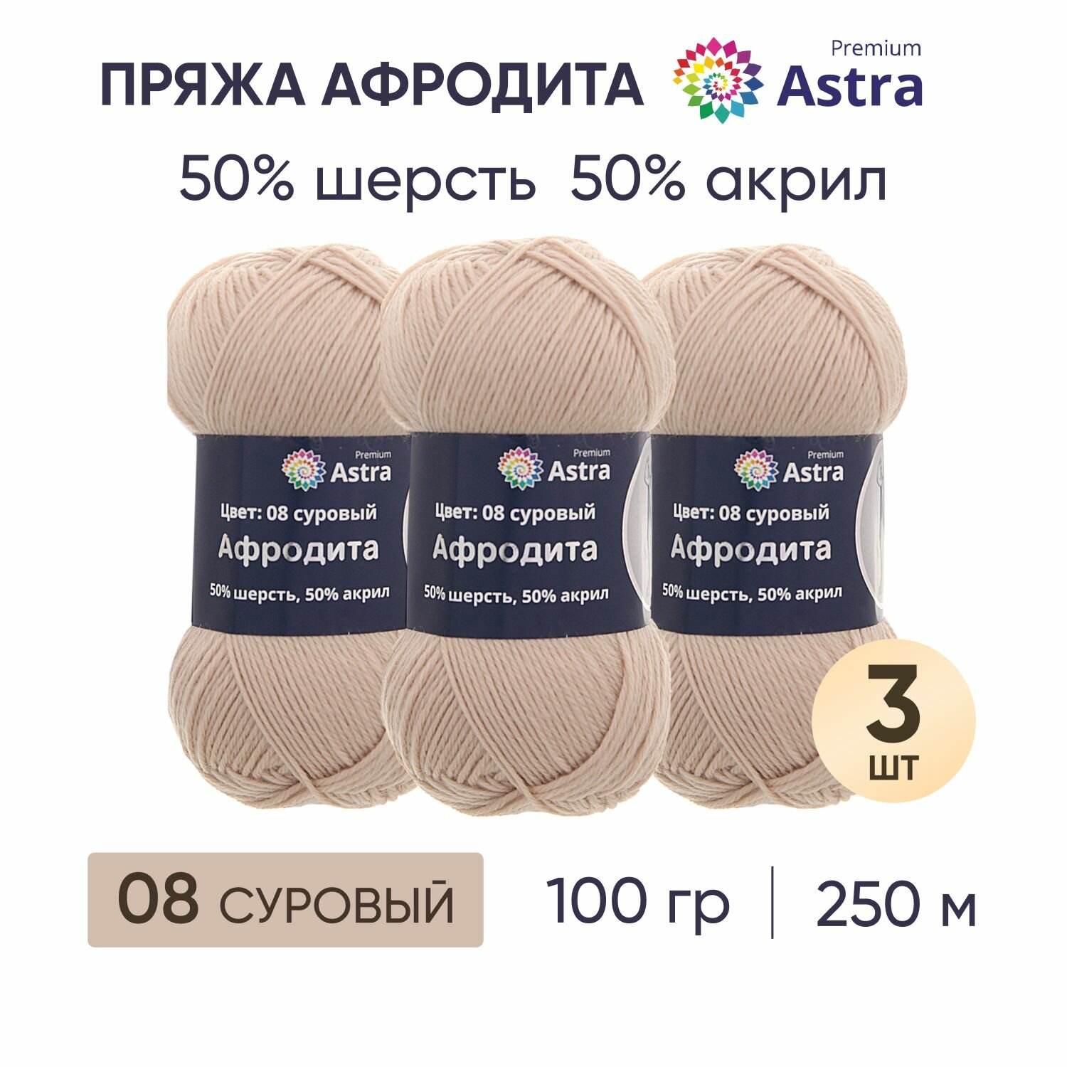 | Комплектация | Упаковка 3 штук Пряжа Astra Premium 'Афродита' 100гр. 250м (50% шерсть, 50% акрил) (08 суровый) |