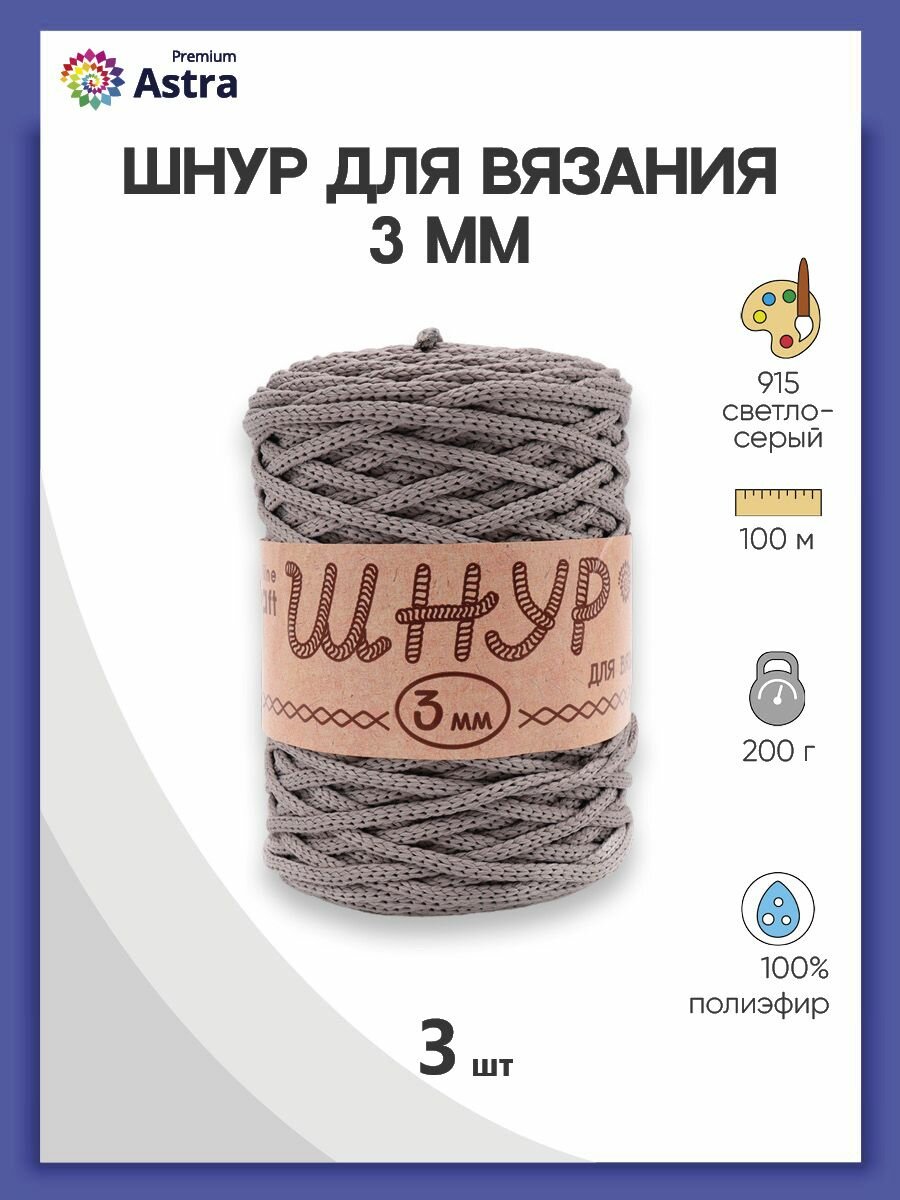 Пряжа для вязания Astra Premium 'Шнур для вязания 3 мм' 200г, 100м (100% полиэфир) (915 светло-серый), 3 мотка