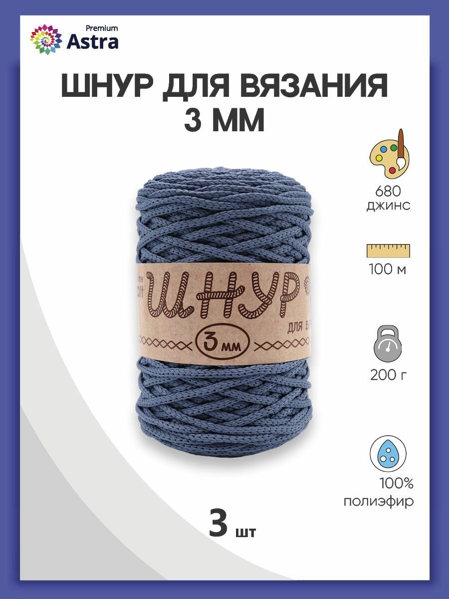 Пряжа для вязания Astra Premium 'Шнур для вязания 3 мм' 200г, 100м (100% полиэфир) (680 джинс), 3 мотка