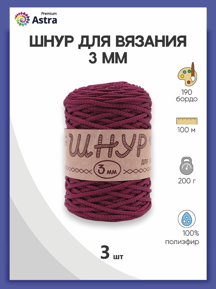 Купить Пряжа для вязания Astra Premium 'Шнур для вязания 3 мм', 200г, 100м (100% полиэфир) (190 бордо), 3 мотка
