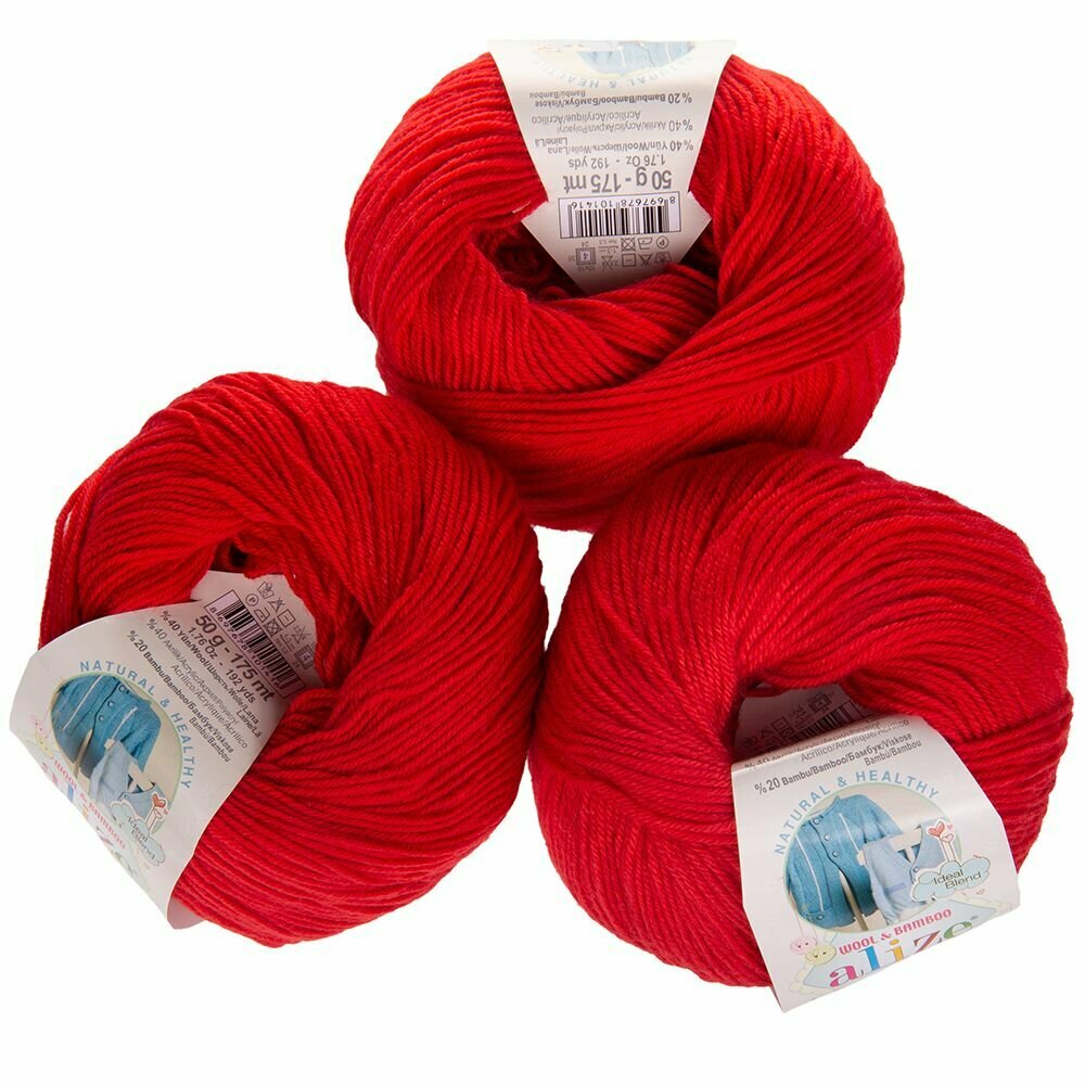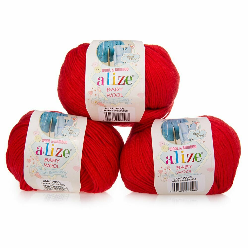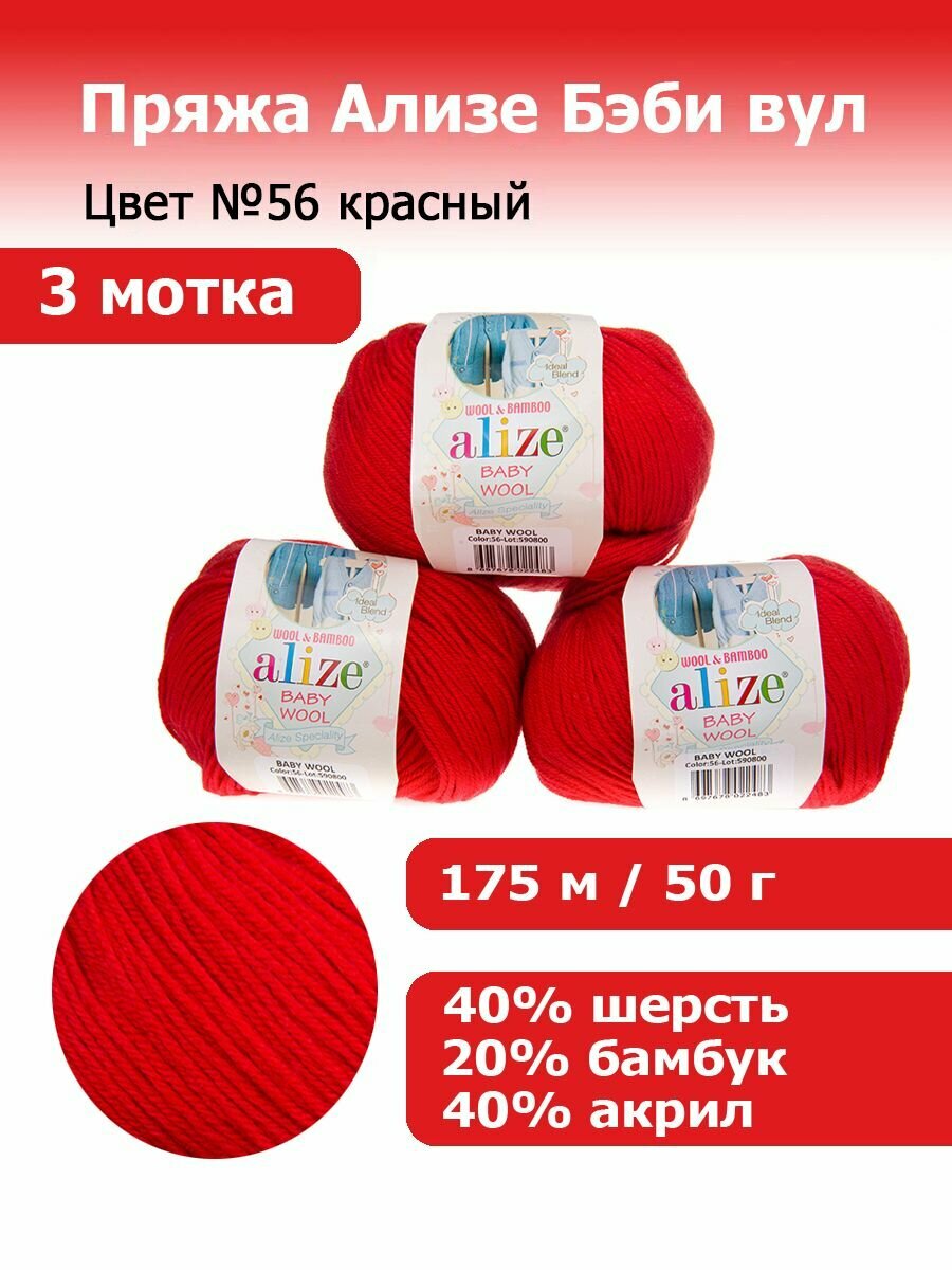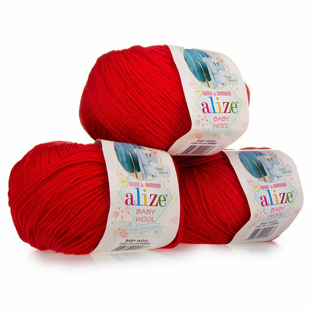 Купить Пряжа Alize baby wool - 3 шт, 56 красный, 175 м/50г, 40% шерсть, 20% бамбук, 40% акрил /Ализе беби вул/