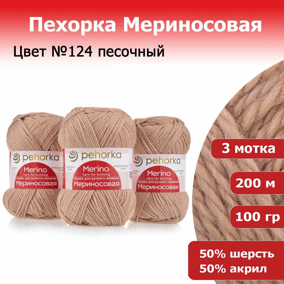Пряжа Пехорка "Мериносовая" - 1 шт, цвет: 124-Песочный, 200м/100г, 50% мериносовая шерсть, 50% акрил