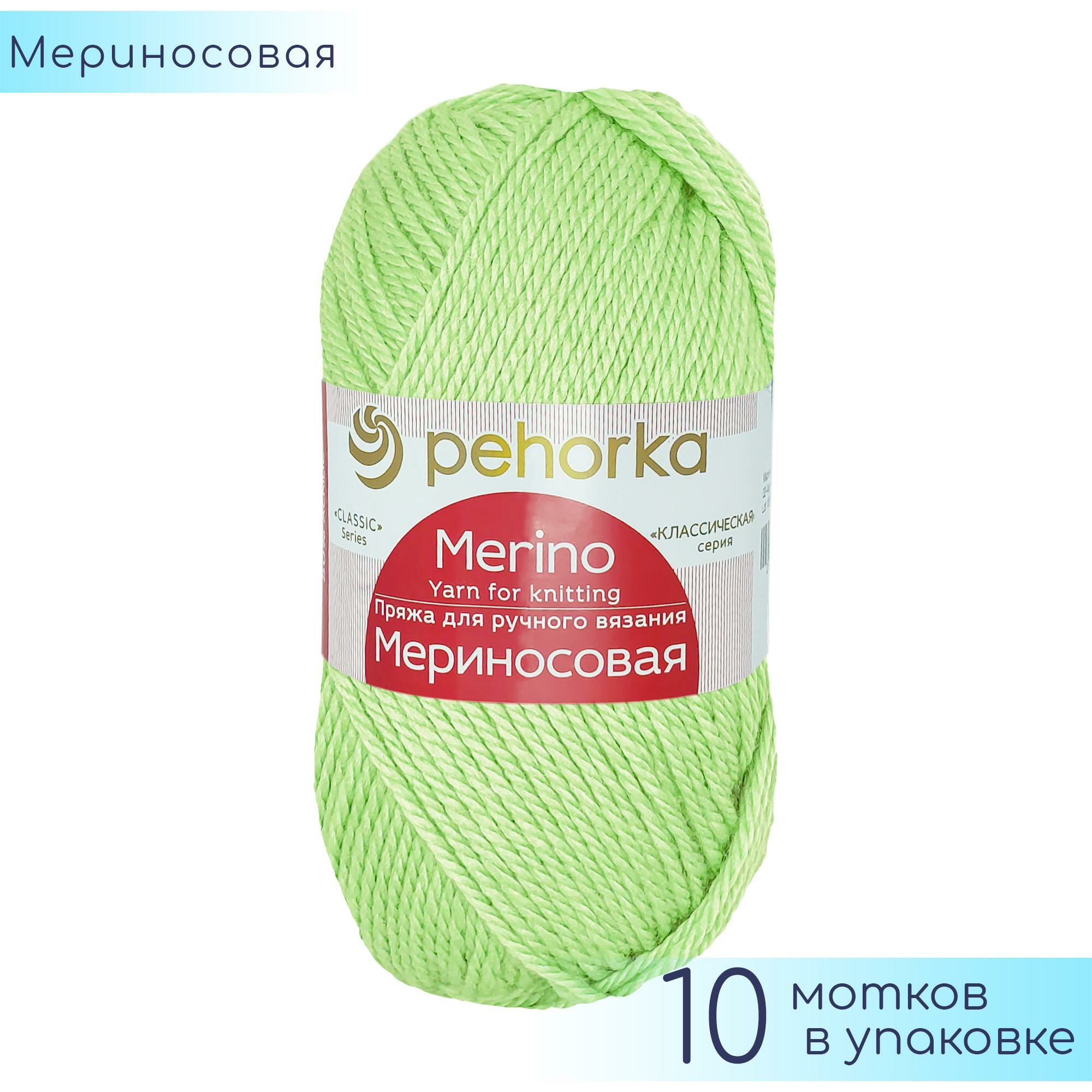 Купить Пряжа для вязания Пехорка 'Мериносовая', 100г, 200м (50% шерсть, 50% акрил) (193 светло-салатовый), 10 мотков