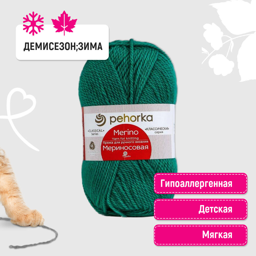 Пряжа Пехорка "Мериносовая" - 1 шт, цвет: 335-Изумруд, 200м/100г, 50% мериносовая шерсть, 50% акрил