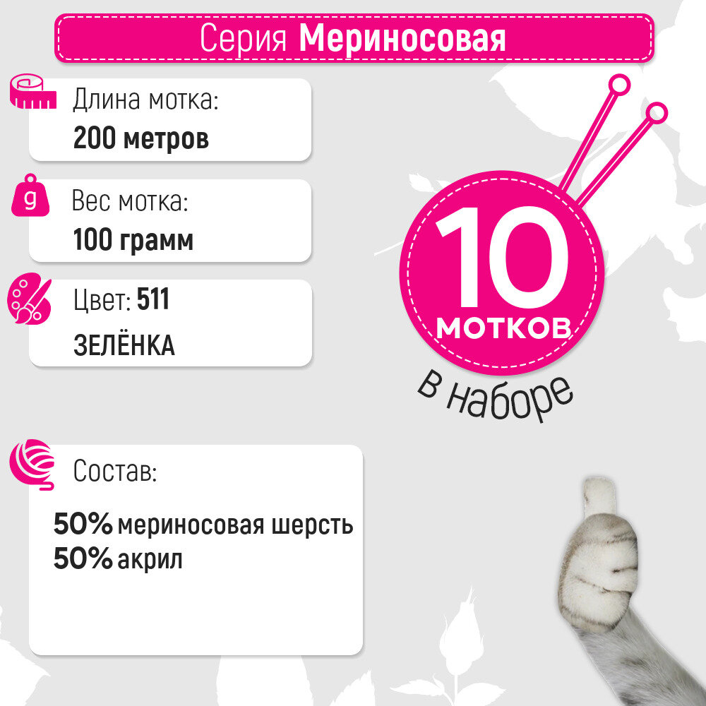 СохранитьПряжа для вязания Пехорка 'Мериносовая', 100г, 200м (50% шерсть, 50% акрил) (511 зеленка), 10 мотков интересное: