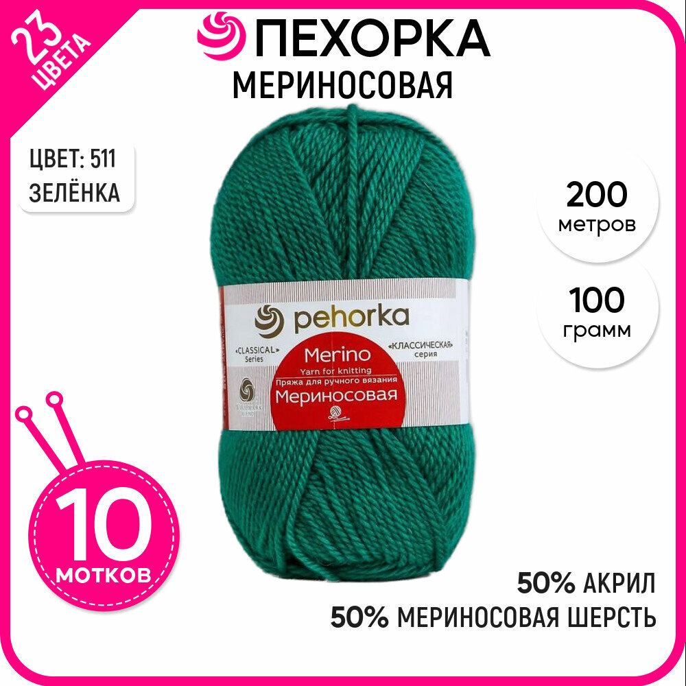 Пряжа для вязания Пехорка 'Мериносовая' 100г, 200м (50% шерсть, 50% акрил) (511 зеленка), 10 мотков