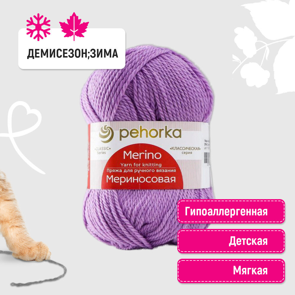 Пряжа Пехорка "Мериносовая" - 1 шт, цвет: 024-Орхидея, 200м/100г, 50% мериносовая шерсть, 50% акрил