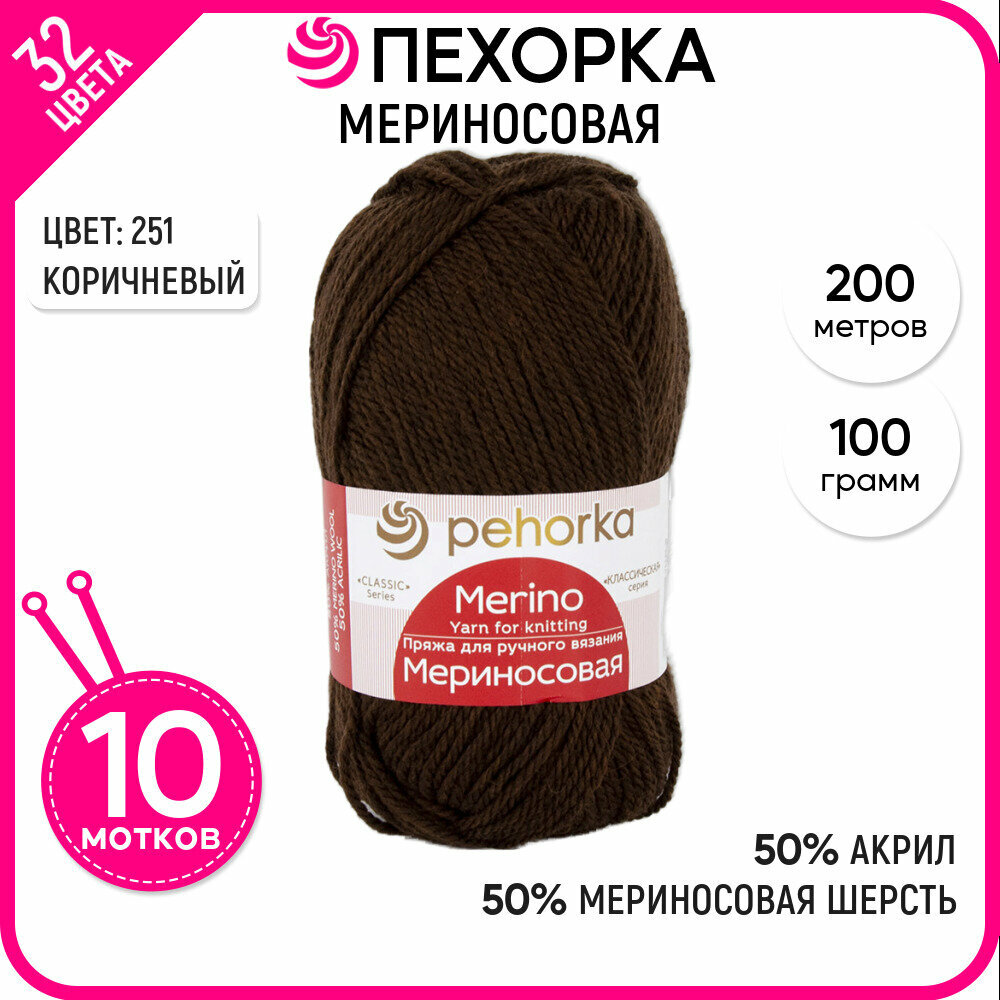 Купить Пряжа для вязания Пехорка 'Мериносовая', 100г, 200м (50% шерсть, 50% акрил) (251 коричневый), 10 мотков