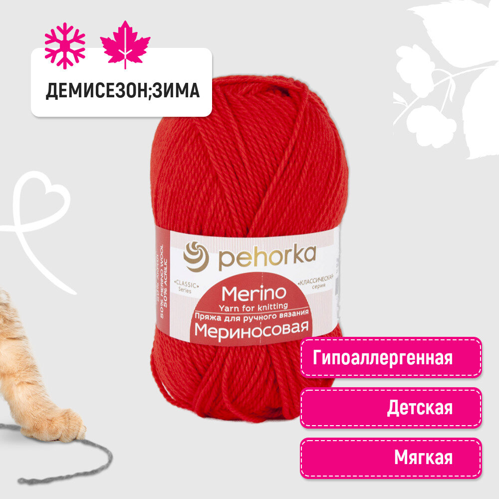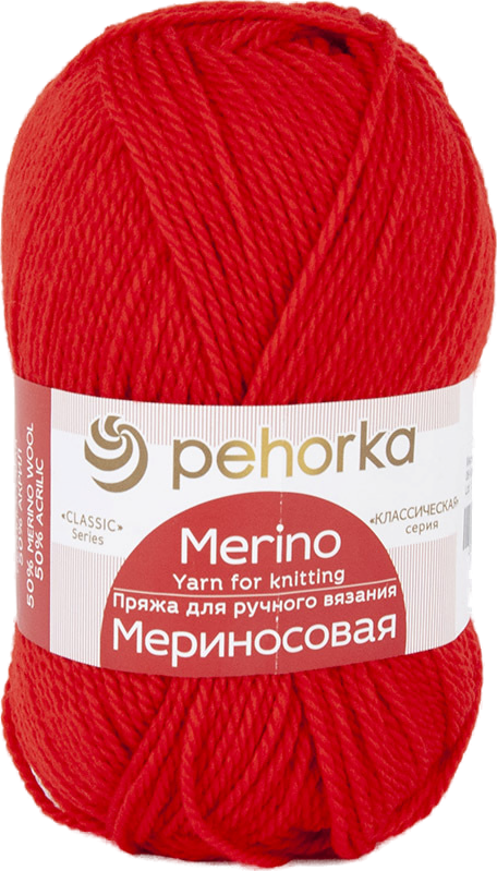 Пряжа Пехорка Мериносовая красный (6), 50%шерсть мериноса/50%акрил, 200м, 100г, 1шт