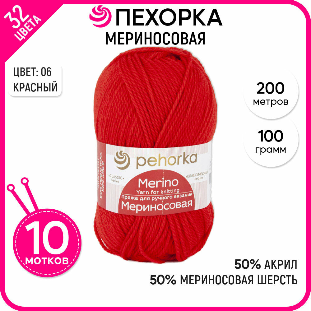 Купить Пряжа для вязания Пехорка 'Мериносовая', 100г, 200м (50% шерсть, 50% акрил) (06 красный), 10 мотков