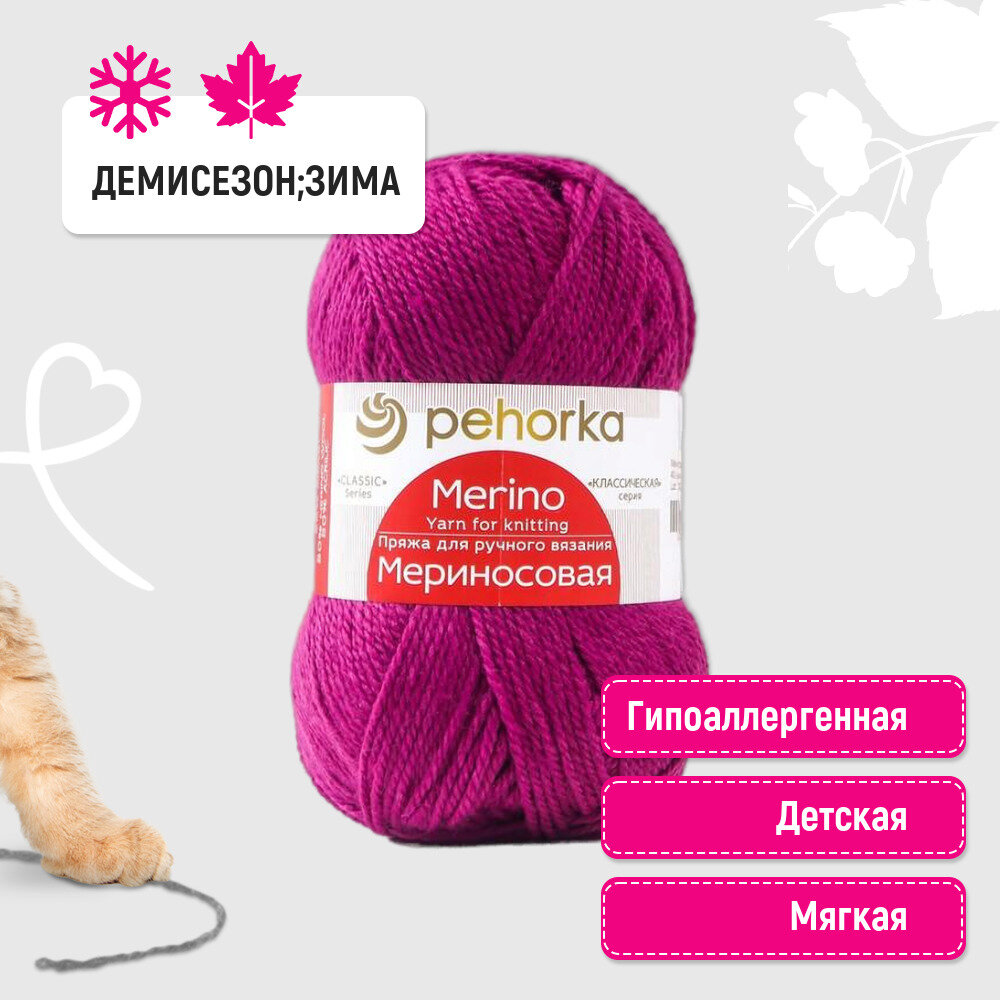 Пряжа Пехорка "Мериносовая" - 1 шт, цвет: 024-Орхидея, 200м/100г, 50% мериносовая шерсть, 50% акрил