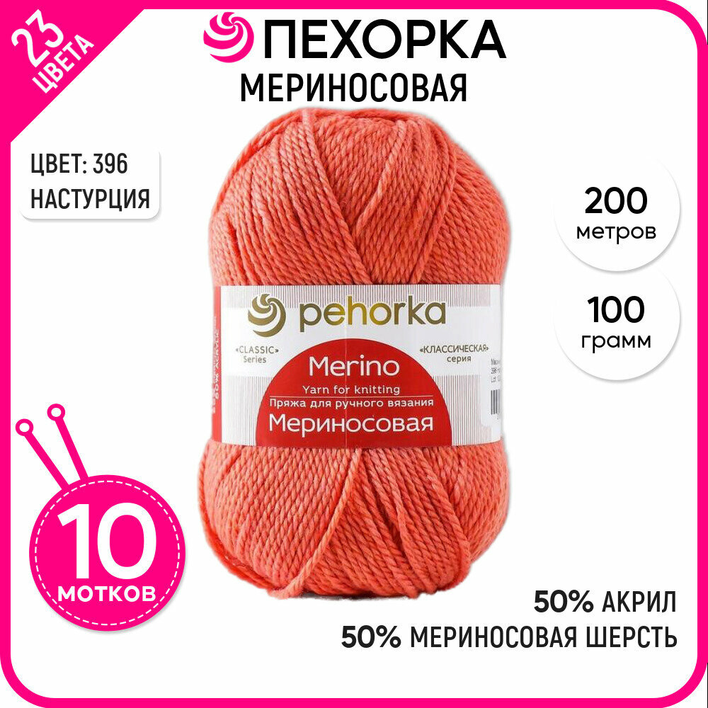 Купить Пряжа для вязания Пехорка 'Мериносовая', 100г, 200м (50% шерсть, 50% акрил) (396 настурция), 10 мотков